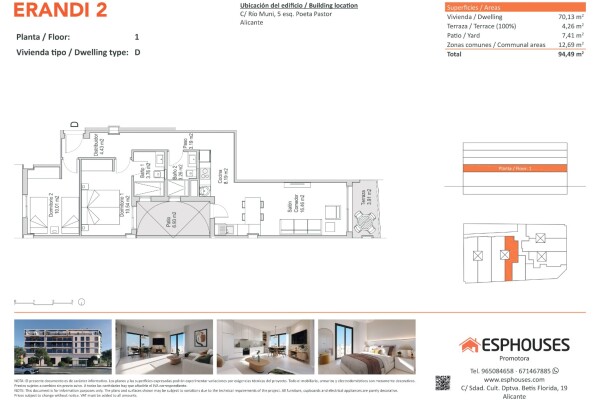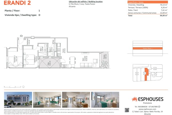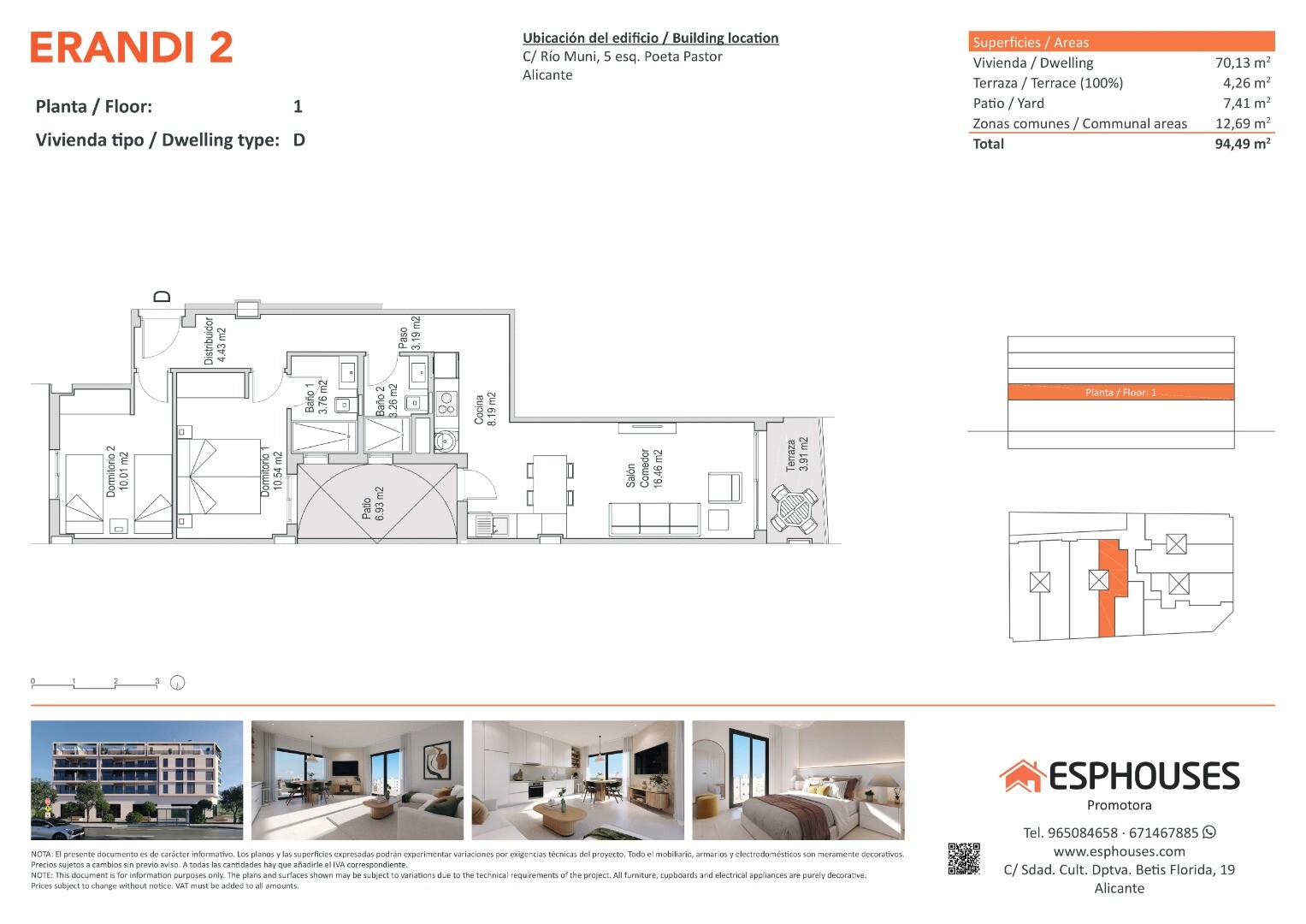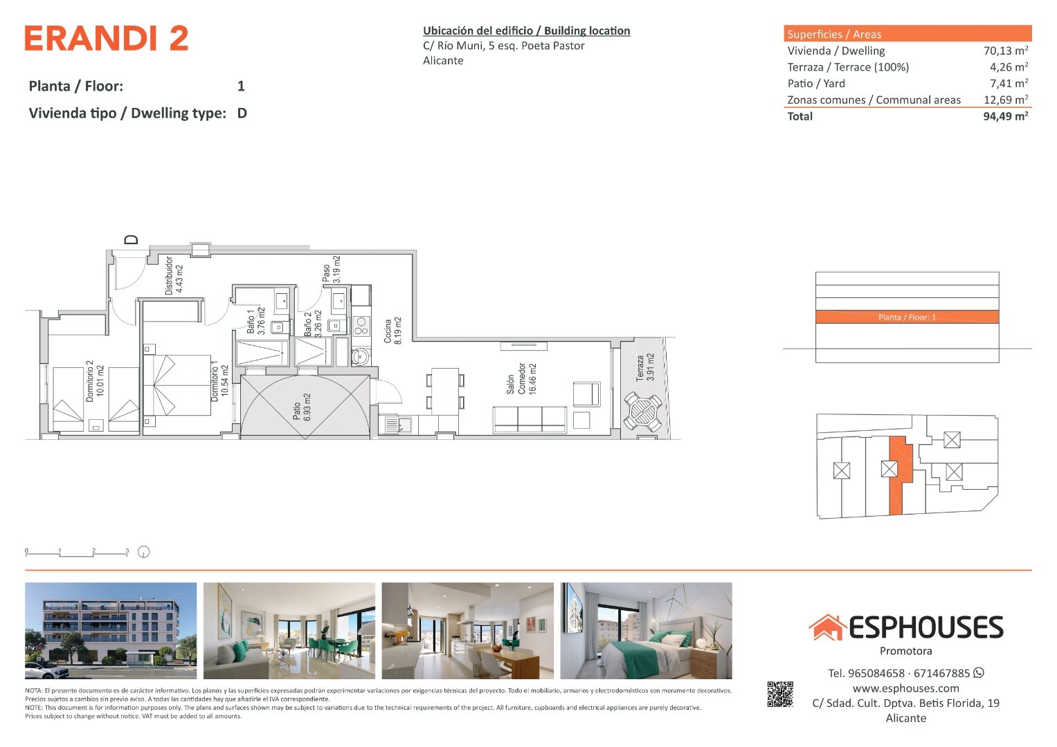 To mieszkanie w nowym budynku, położone na pierwszym piętrze budynku ERANDI 2, oferuje łączną powierzchnię 70,13 m². Nowoczesny i funkcjonalny projekt zawiera taras o powierzchni 4,26 m² oraz patio o powierzchni 7,41 m² — idealne do relaksu na świeżym powietrzu.