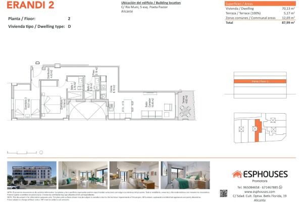 To atrakcyjne mieszkanie z rynku pierwotnego znajduje się na drugim piętrze budynku ERANDI 2 – nowoczesnego osiedla z basenem wspólnym na dachu, położonego w znanej dzielnicy La Florida — jednej z najlepiej skomunikowanych i dynamicznie rozwijających się części Alicante. Powierzchnia mieszkania to 70,13 m², obejmuje ono dwie sypialnie z szafami wnę...kowymi, dwie łazienki, jasny salon z otwartą kuchnią oraz przytulny taras o powierzchni 5,17 m², wychodzący na zachód — idealny na popołudniowe słońce.