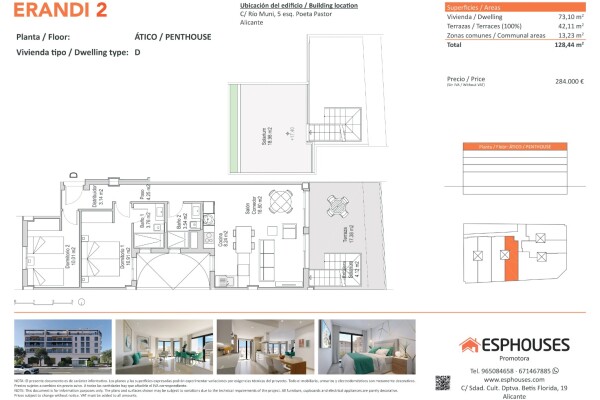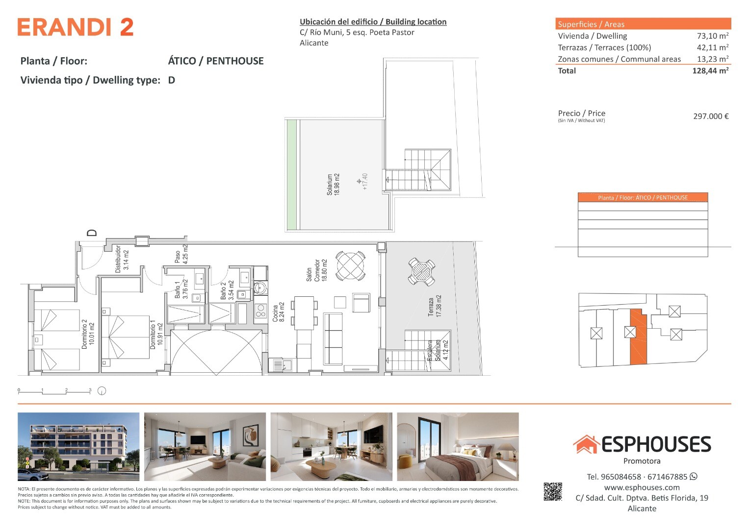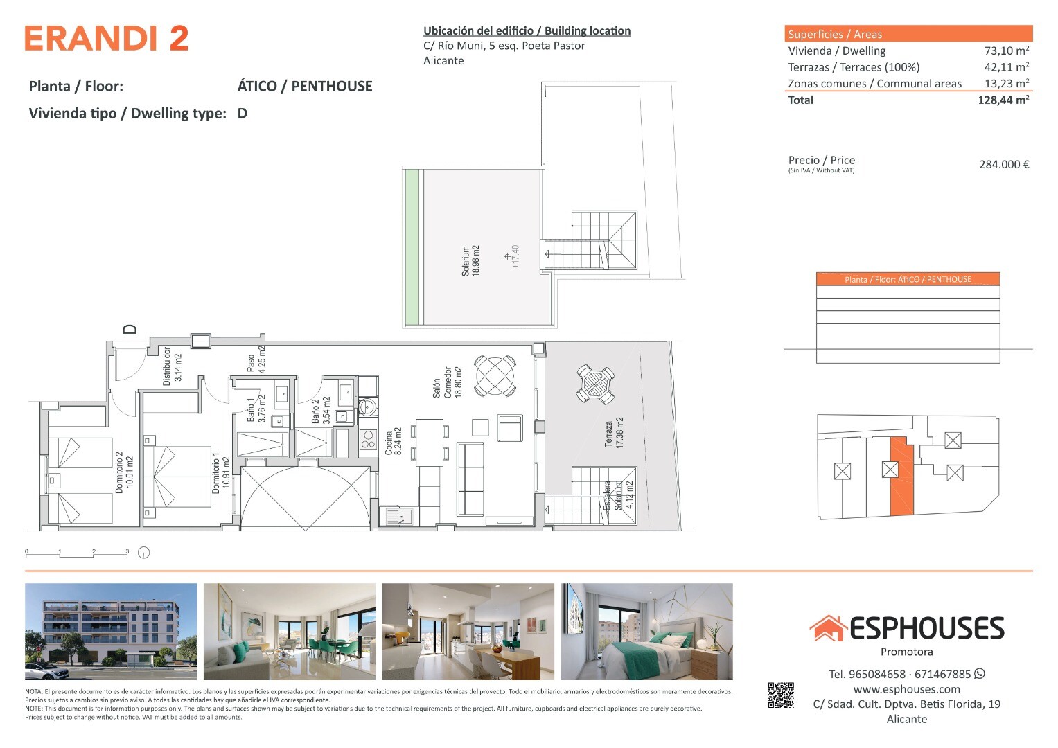 Ten nowy penthouse znajduje się na czwartym piętrze budynku ERANDI 2, w znanej i dobrze skomunikowanej dzielnicy La Florida w Alicante. Powierzchnia zabudowana wynosi 73,10 m² i obejmuje dwie sypialnie z szafami wnękowymi, dwie łazienki oraz salon z jadalnią i otwartą kuchnią w nowoczesnym stylu, z maksymalnym wykorzystaniem światła dziennego.