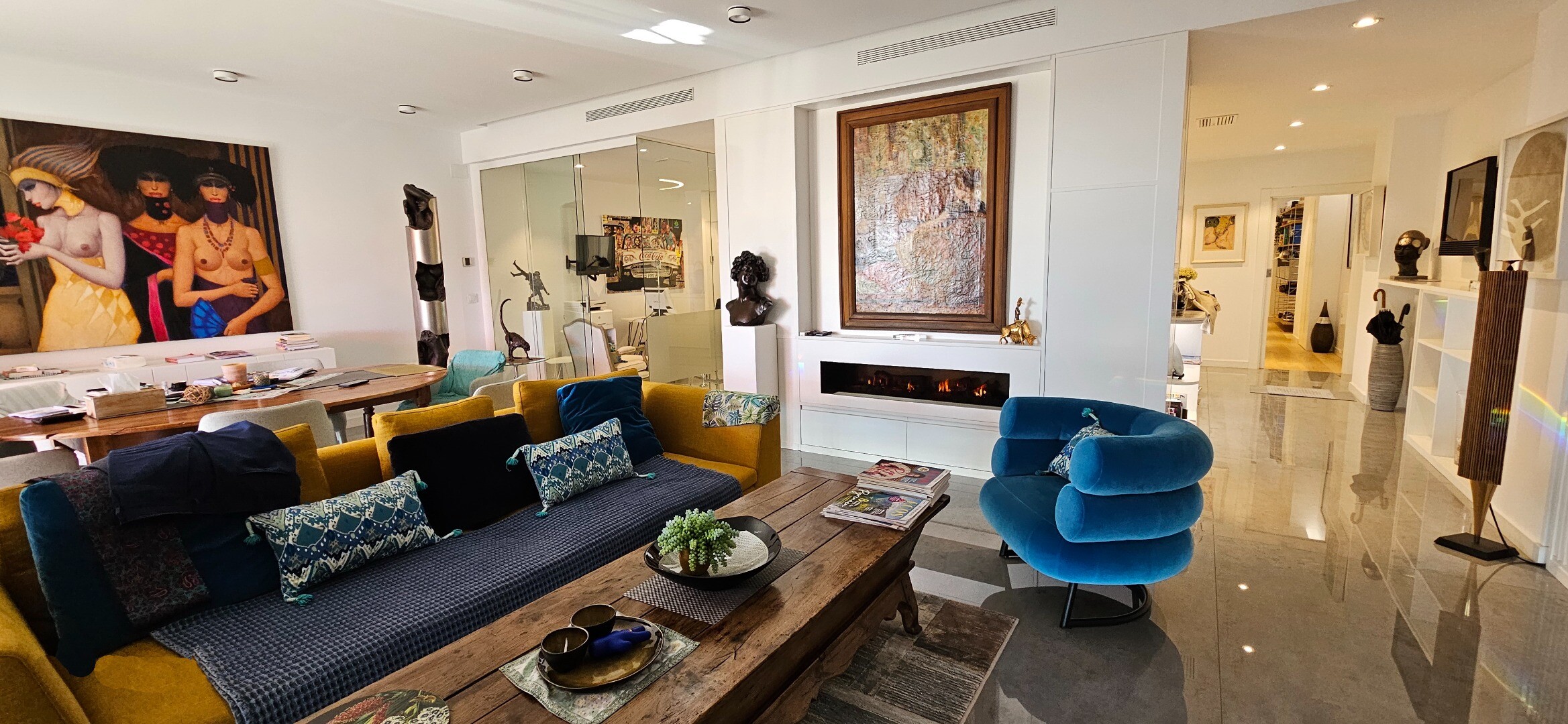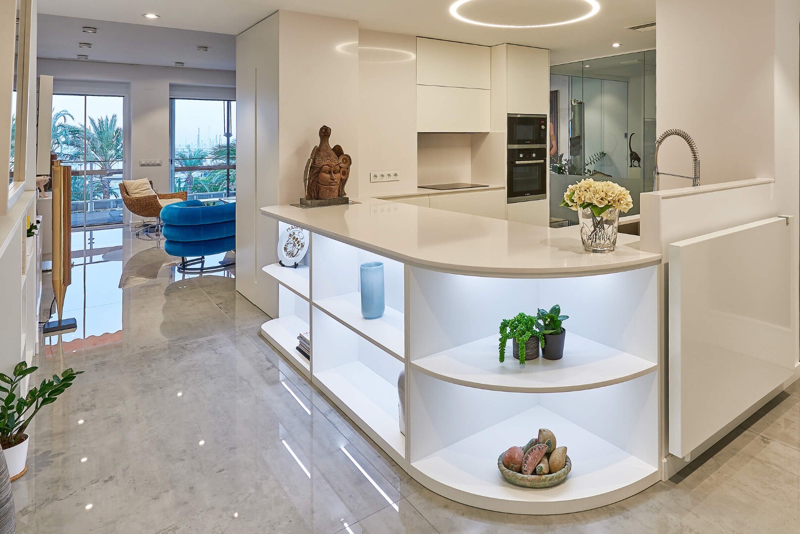 Salon z jadalnią stanowi serce domu: przestronna i wyrafinowana przestrzeń, wzbogacona dekoracyjnym kominkiem elektrycznym, który dodaje ciepła i elegancji. Przestrzeń ta otwiera się bezpośrednio na wspaniały taras od strony południowej, zapewniając doskonałe naturalne światło przez cały dzień i tworząc płynne połączenie między wnętrzem a otoczeniem, idealne do cieszenia się śródziemnomorskim klimatem i widokiem na morze.