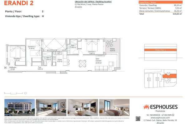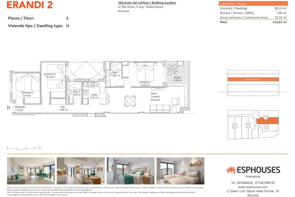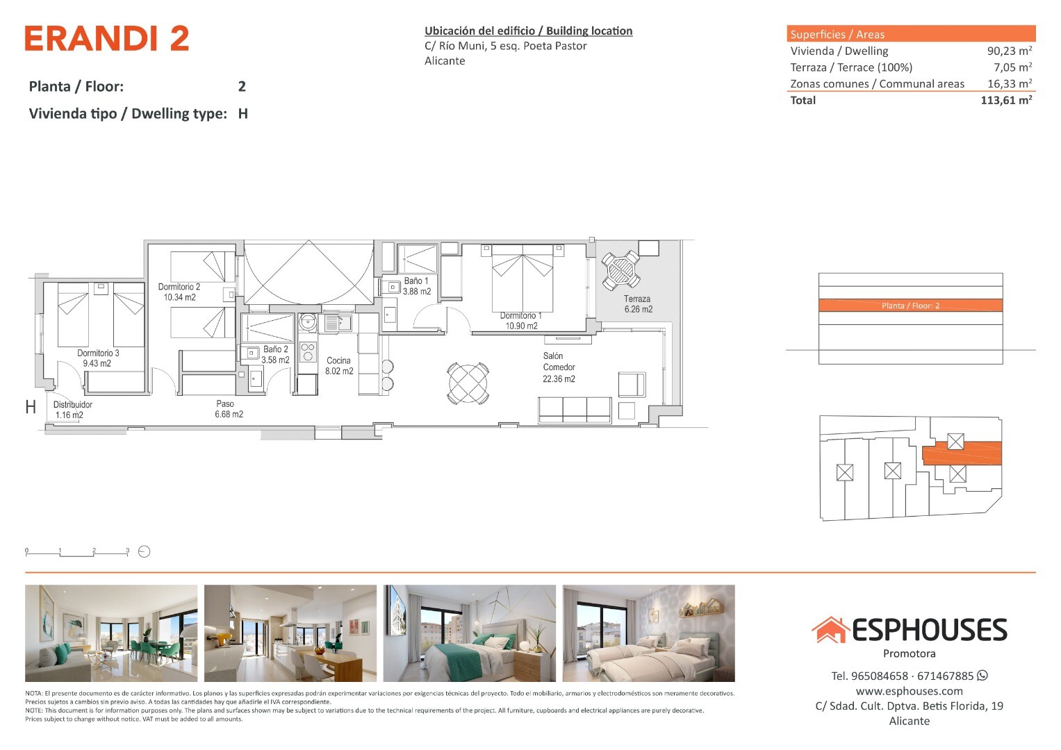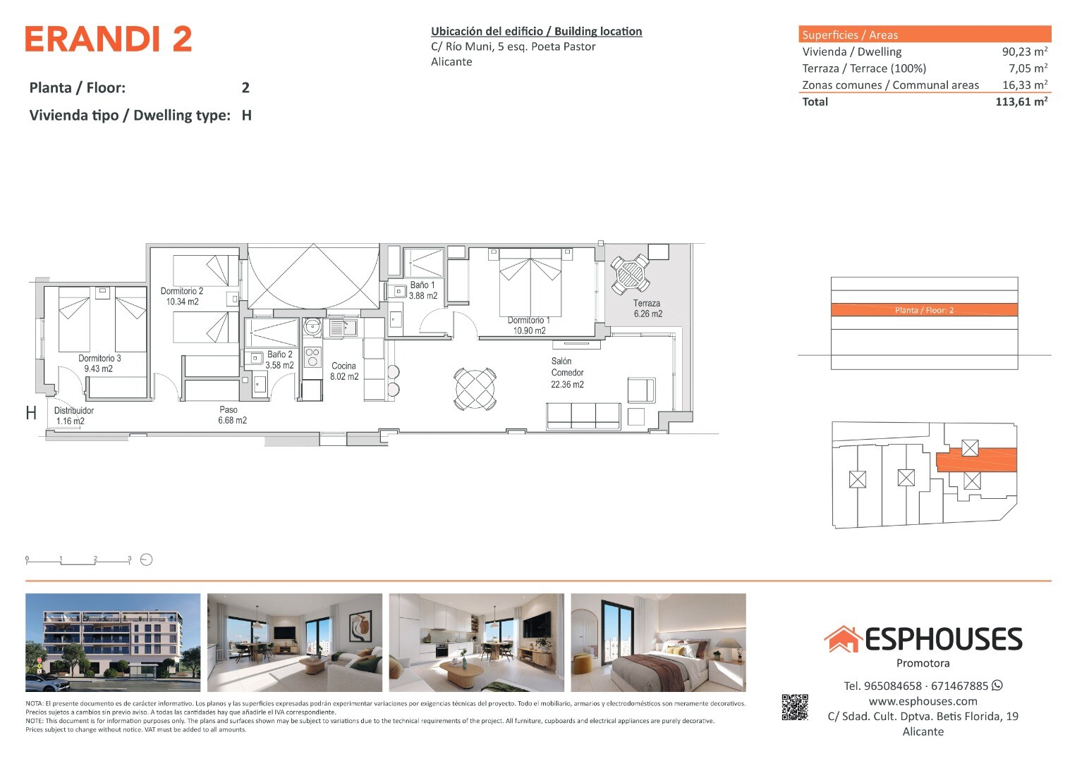To jasne mieszkanie z rynku pierwotnego znajduje się na drugim piętrze budynku ERANDI 2, zlokalizowanego w znanej i dobrze skomunikowanej dzielnicy La Florida w Alicante. Powierzchnia użytkowa wynosi 90,23 m² i obejmuje trzy sypialnie z szafami wnękowymi, dwie łazienki, salon z otwartą kuchnią oraz taras o powierzchni 7,05 m² z ekspozycją południow...ą — idealny do korzystania ze słońca przez cały dzień.