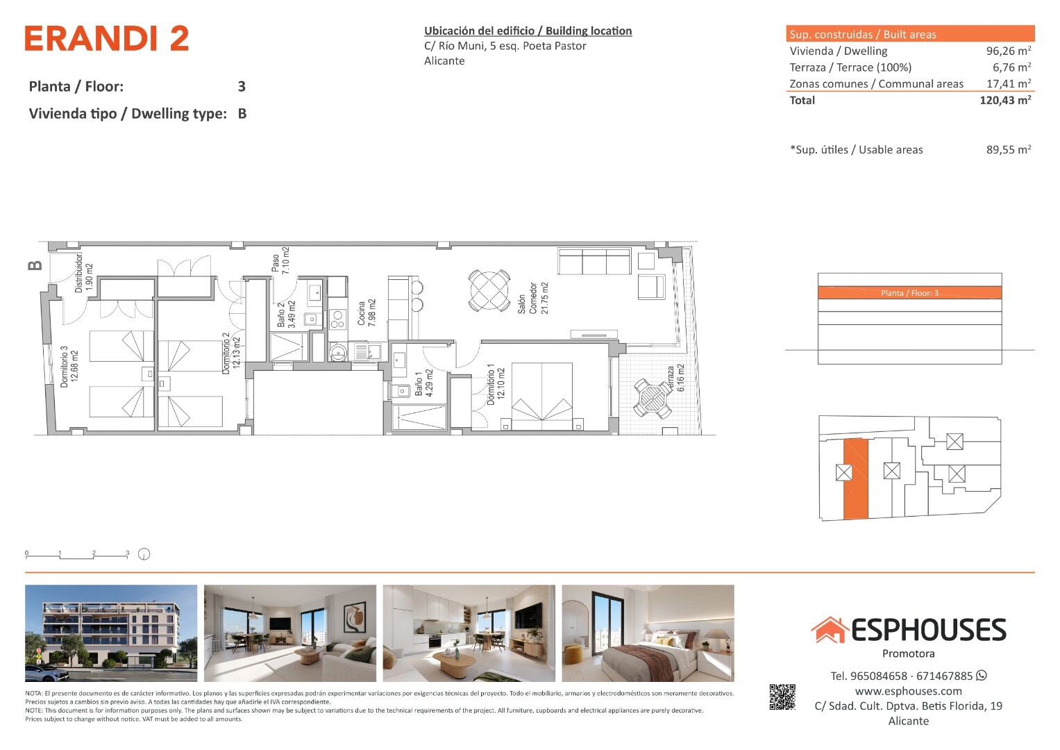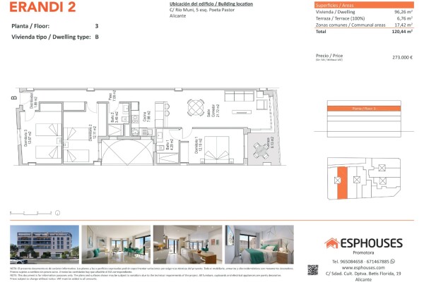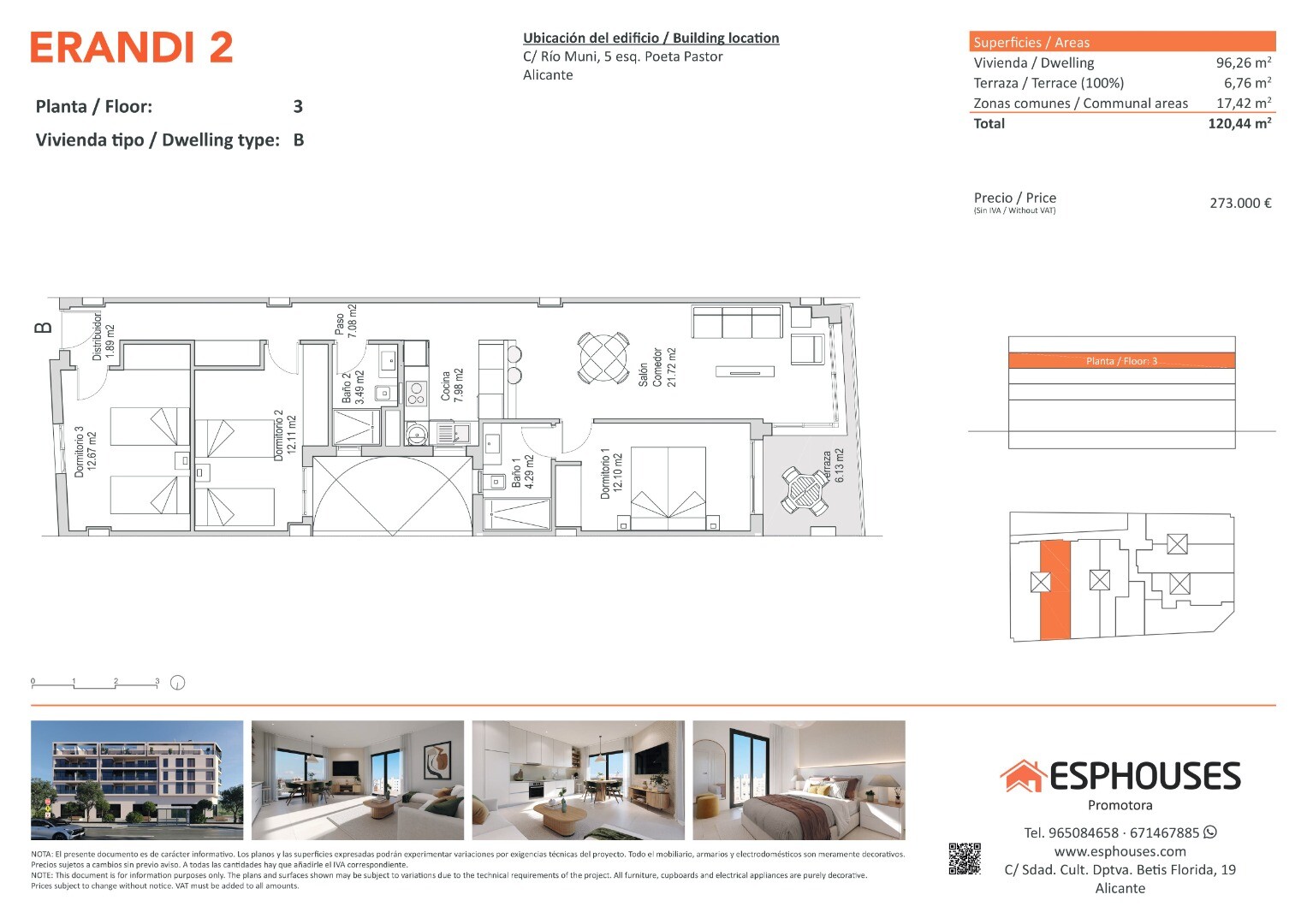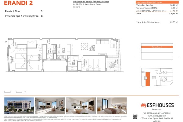 To jasne mieszkanie na trzecim piętrze budynku ERANDI 2 łączy przestrzeń, nowoczesny design i doskonałą lokalizację w dobrze skomunikowanej dzielnicy La Florida w Alicante. Powierzchnia zabudowana wynosi 96,26 m² i obejmuje trzy sypialnie z szafami wnękowymi, dwie łazienki, salon z kuchnią na otwartym planie oraz prywatny taras 6,76 m² z ekspozycją... zachodnią – idealny na popołudniowe słońce.