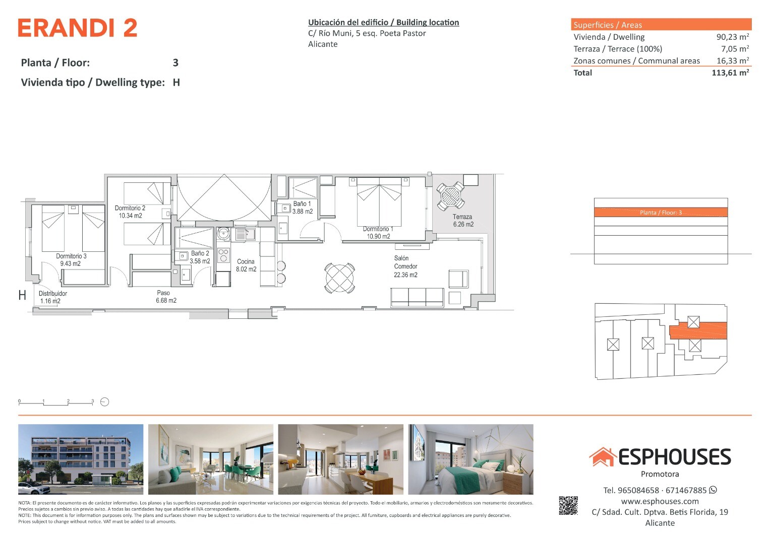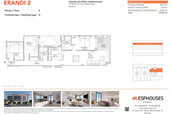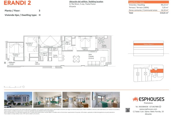 To nowe mieszkanie znajduje się na trzecim piętrze budynku ERANDI 2 i oferuje powierzchnię zabudowaną 90,23 m². Nowoczesny, funkcjonalny projekt i doskonała ekspozycja na południe czynią je doskonałą opcją w prestiżowej dzielnicy La Florida – dobrze skomunikowanej części Alicante.