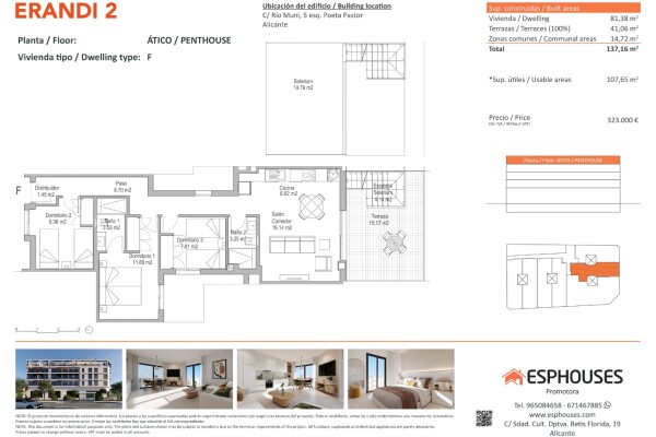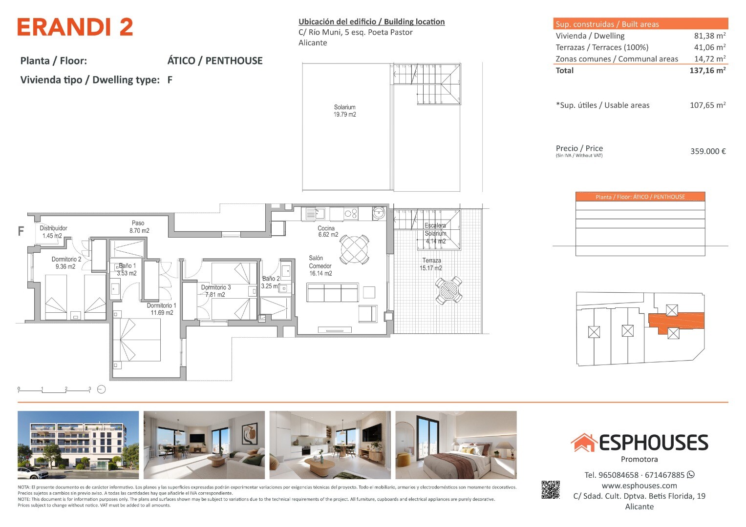 Ten nowoczesny penthouse znajduje się na czwartym piętrze budynku ERANDI 2, w prestiżowej dzielnicy La Florida — jednej z najlepiej skomunikowanych i rozwiniętych części Alicante. Mieszkanie oferuje 81,38 m² powierzchni zabudowanej, obejmującej trzy sypialnie z wbudowanymi szafami, dwie kompletne łazienki oraz przestronny salon z jadalnią i otwartą... kuchnią w nowoczesnym, funkcjonalnym układzie.