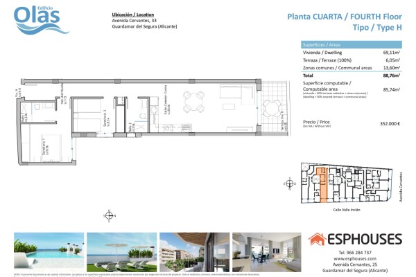 Położony w jednym z najbardziej poszukiwanych obszarów Guardamar del Segura, przy Avenida de Cervantes, Edificio Olas będzie idealnym wyborem ze względu na uprzywilejowaną lokalizację w pobliżu plaży i szerokiej gamy usług. Ten nowoczesny budynek zaoferuje swoim mieszkańcom wyjątkowe doświadczenie życiowe, łącząc komfort, styl i nadmorskie otoczeni...e. Mieszkanie dostępne w tym budynku składa się z 2 sypialni, 2 łazienek, przestronnego salonu-jadalni ze zintegrowaną kuchnią i pięknego tarasu. Z powierzchnią zabudowy 85,74 metrów kwadratowych i tarasem o powierzchni 6,05 metrów kwadratowych, przestrzeń ta oferuje przestronność i komfort dla całej rodziny. Wykończenia i funkcje tego mieszkania będą wysokiej jakości. Będzie ono wyposażone w instalację klimatyzacyjną, która zagwarantuje chłodną i przyjemną atmosferę przez cały rok. Ponadto zintegrowana automatyka domowa pozwala na inteligentne i wygodne sterowanie różnymi funkcjami w domu, zapewniając większy komfort i energooszczędność. Kuchnia, zaprojektowana z myślą o stylu i funkcjonalności, zostanie wyposażona w najwyższej jakości sprzęt AGD, w tym piekarnik, zmywarkę, chłodziarko-zamrażarkę, okap i płytę indukcyjną. Przygotowywanie pysznych posiłków będzie przyjemnością w tej dobrze wyposażonej przestrzeni. Edificio Olas oferuje również możliwość nabycia miejsca parkingowego i komórki lokatorskiej w tym samym budynku, co zapewnia dodatkową wygodę i bezpieczeństwo mieszkańcom. Dzięki temu nie będzie obaw o parkowanie lub przechowywanie dodatkowych rzeczy. Oprócz wewnętrznych udogodnień, budynek będzie wyposażony we wspaniały basen na dachu, w którym mieszkańcy będą mogli cieszyć się orzeźwiającymi kąpielami i relaksującymi chwilami na słońcu. Krótko mówiąc, Edificio Olas w Guardamar del Segura to wyjątkowa okazja do nabycia nowoczesnego mieszkania w bezkonkurencyjnej lokalizacji. Dzięki nowoczesnemu designowi, wysokiej jakości udogodnieniom oraz bliskości plaży i usług, miejsce to obiecuje komfortowe życie pełne niezapomnianych chwil na pięknym wybrzeżu Morza Śródziemnego.