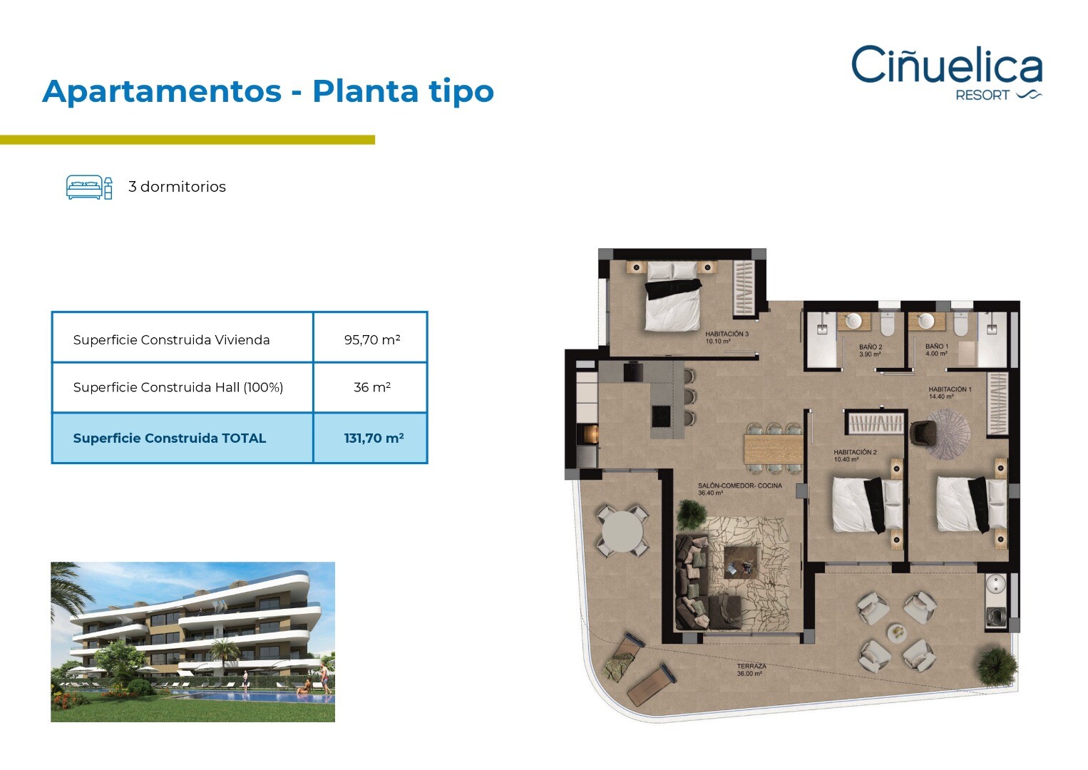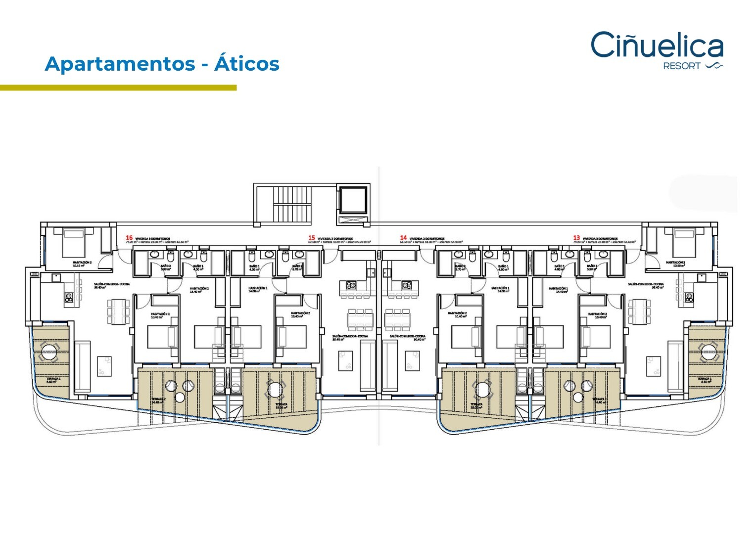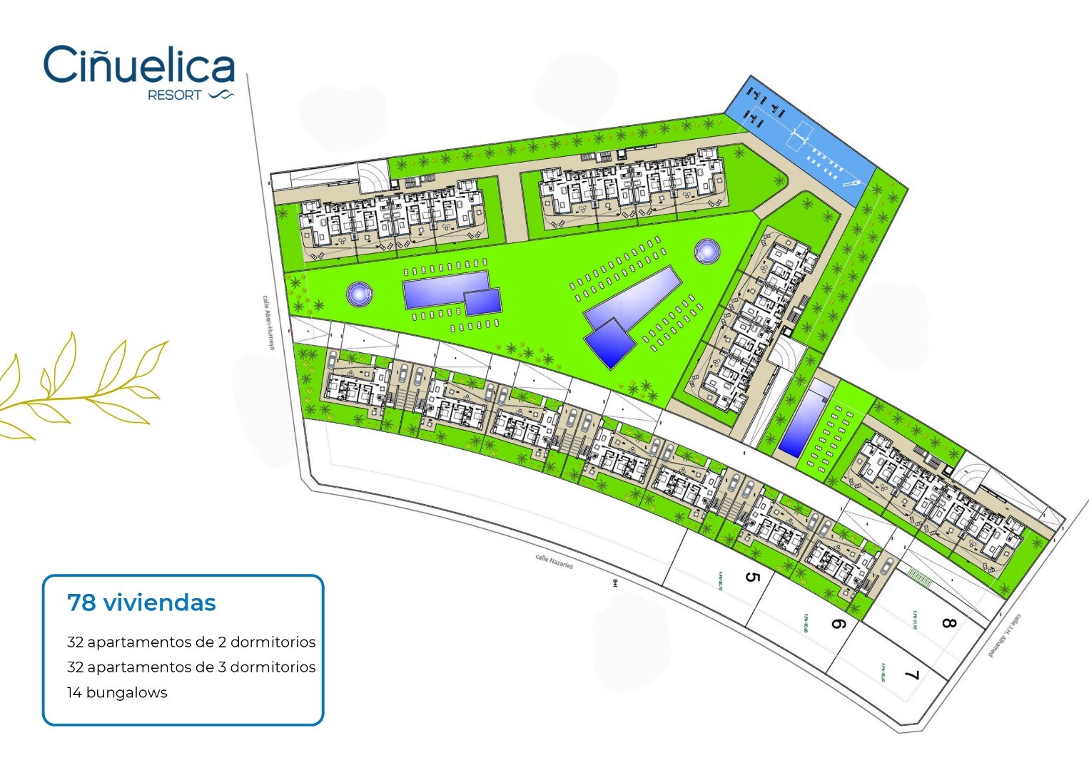 La Cinuelica Resort to rezydencja składająca się z 4 apartamentowców, w których znajdują się łącznie 32 apartamenty z 2 sypialniami, 32 apartamenty z 3 sypialniami i 14 bungalowów z 3 sypialniami. Apartamenty wyposażone są w podziemne miejsce parkingowe i komórkę lokatorską, sprzęt kuchenny (lodówko-zamrażarka, płyta ceramiczna, piekarnik, kuchenka...