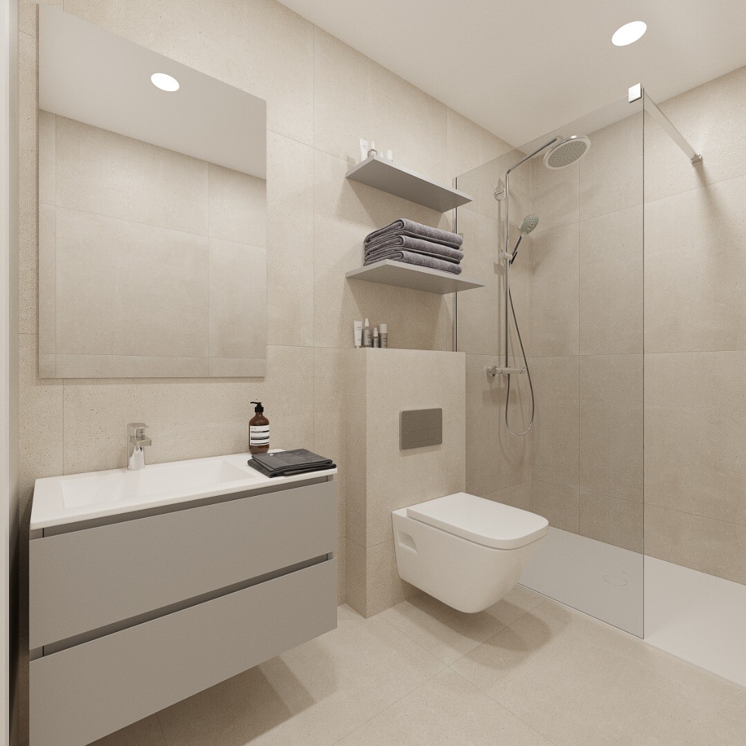 Basen ma dostęp podobny do plaży, prysznice i dużą drewnianą pergolę. Istnieją obszary krajobrazowe z palmami i inną roślinnością, z których wszystkie są oświetlone. W centralnej części basenu znajduje się płytszy obszar, w którym znajdują się łóżka wodne. Aby poprawić efektywność energetyczną, nieruchomości wyposażone są w panel fotowoltaiczny z mikroinwerterem o mocy 730 Wp, platformę monitorującą za pośrednictwem aplikacji. Panel 450 Wp na dachu, który oszczędza energię na zużyciu energii elektrycznej przez dom. Każda nieruchomość posiada przypisane miejsce parkingowe jak najbliżej własnego bloku, na parterze. Dostęp do miejsc parkingowych zapewniają dwie zdalnie sterowane bramy wjazdowe z napędem. Na parkingu przewidziano możliwość przyszłej instalacji punktu ładowania pojazdów elektrycznych z indywidualnego licznika każdego z mieszkań, zgodnie z przepisami.