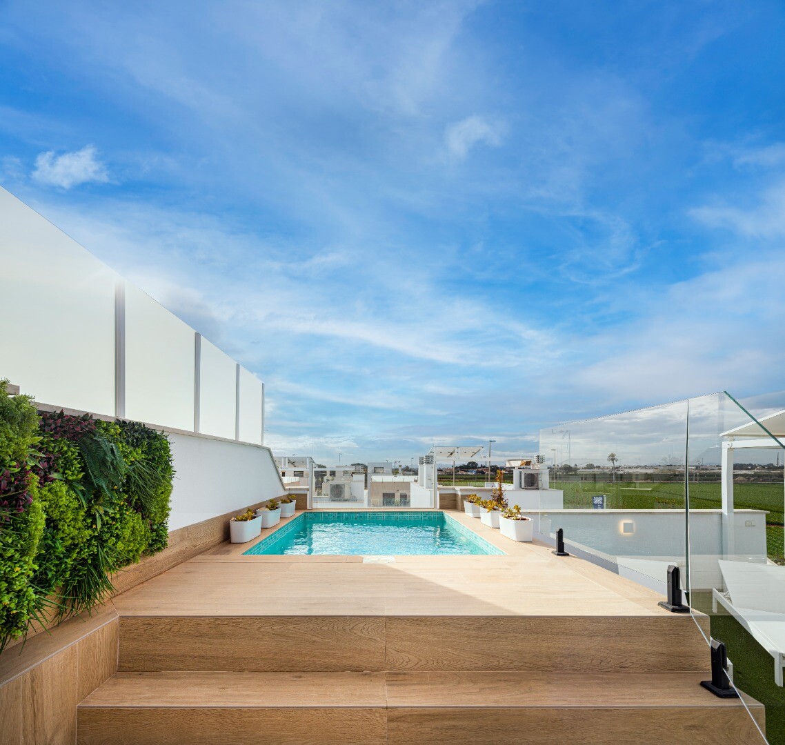 Ta rezydencja „Portomarina Higuericas” znajduje się zaledwie 500 metrów od plaży. Jeśli chcesz mieszkać 500 metrów od najpopularniejszej plaży Orihuela Costa, skorzystaj z tej okazji, ponieważ zostały tylko 2, a termin oddania to lato 2025 r. Jednak ten gotowy pod klucz penthouse nie zostanie wydany ze wszystkimi meblami i instalacjami do początku ...2026 r. Wszystkie domy mają prywatny basen, sprzęt kuchenny (płyta indukcyjna, okap, piekarnik, kuchenka mikrofalowa, lodówka z zamrażarką i pralka), w pełni wyposażone łazienki z kabinami prysznicowymi, umywalką z lustrem i ogrzewaniem podłogowym, wstępnie zainstalowaną klimatyzację z kanałami powietrznymi, oświetlenie LED wewnątrz i na zewnątrz, prysznic z ciepłą wodą na tarasie. Domy mają klasę energetyczną A, ponieważ wykorzystują podwójne szkło Climalit i panel słoneczny. Centrum Torre de la Horadada z licznymi barami i restauracjami znajduje się około 1800 metrów dalej. Na lotniska w Murcii i Alicante można dojechać w około 35 minut z Murcii i 45 minut z Alicante.