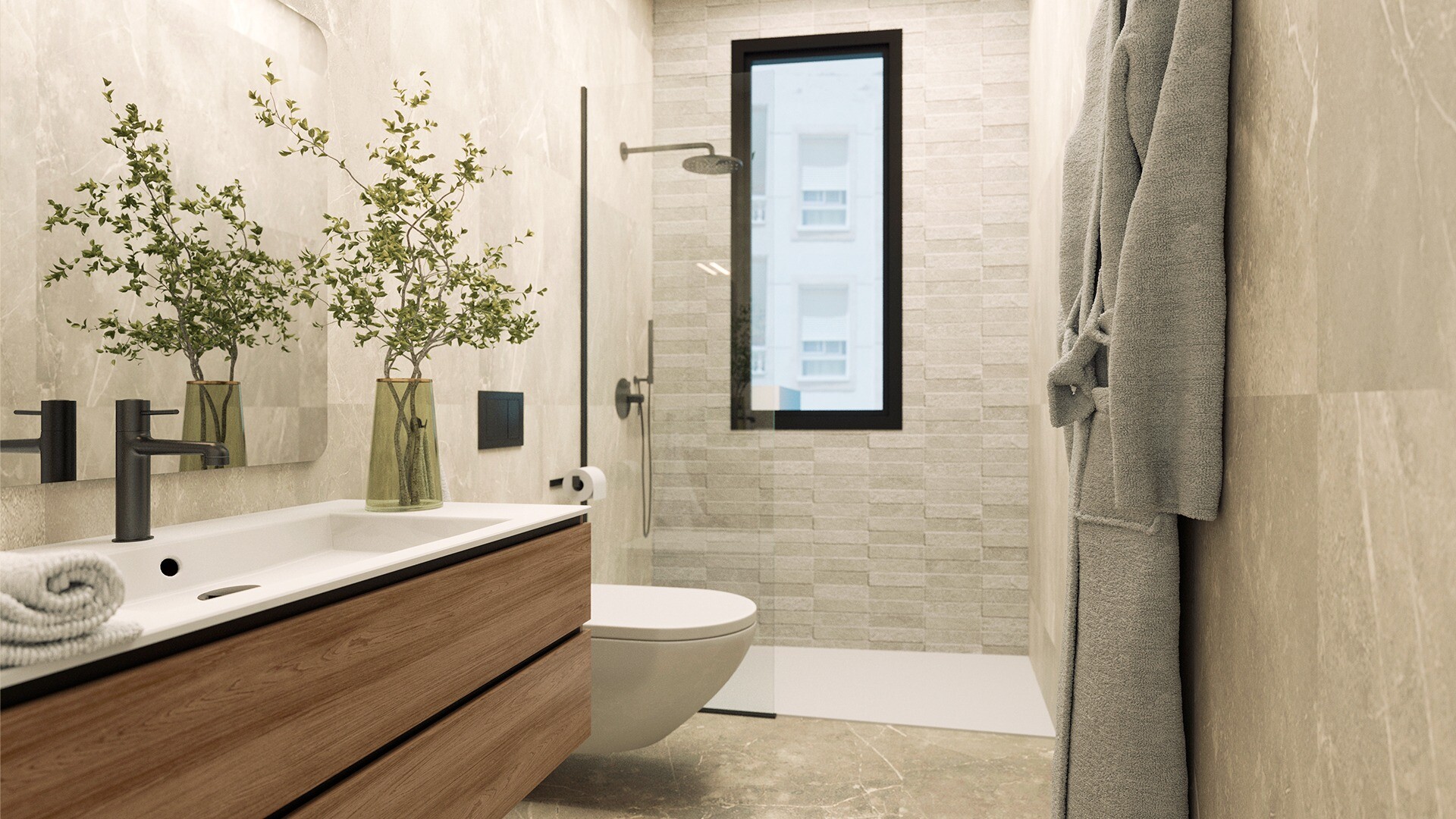 Budynek oferuje doskonałe części wspólne: basen na parterze z częścią dla dzieci, siłownię i saunę, a także taras na dachu z przestrzeniami chill-out otoczonymi bujną roślinnością.