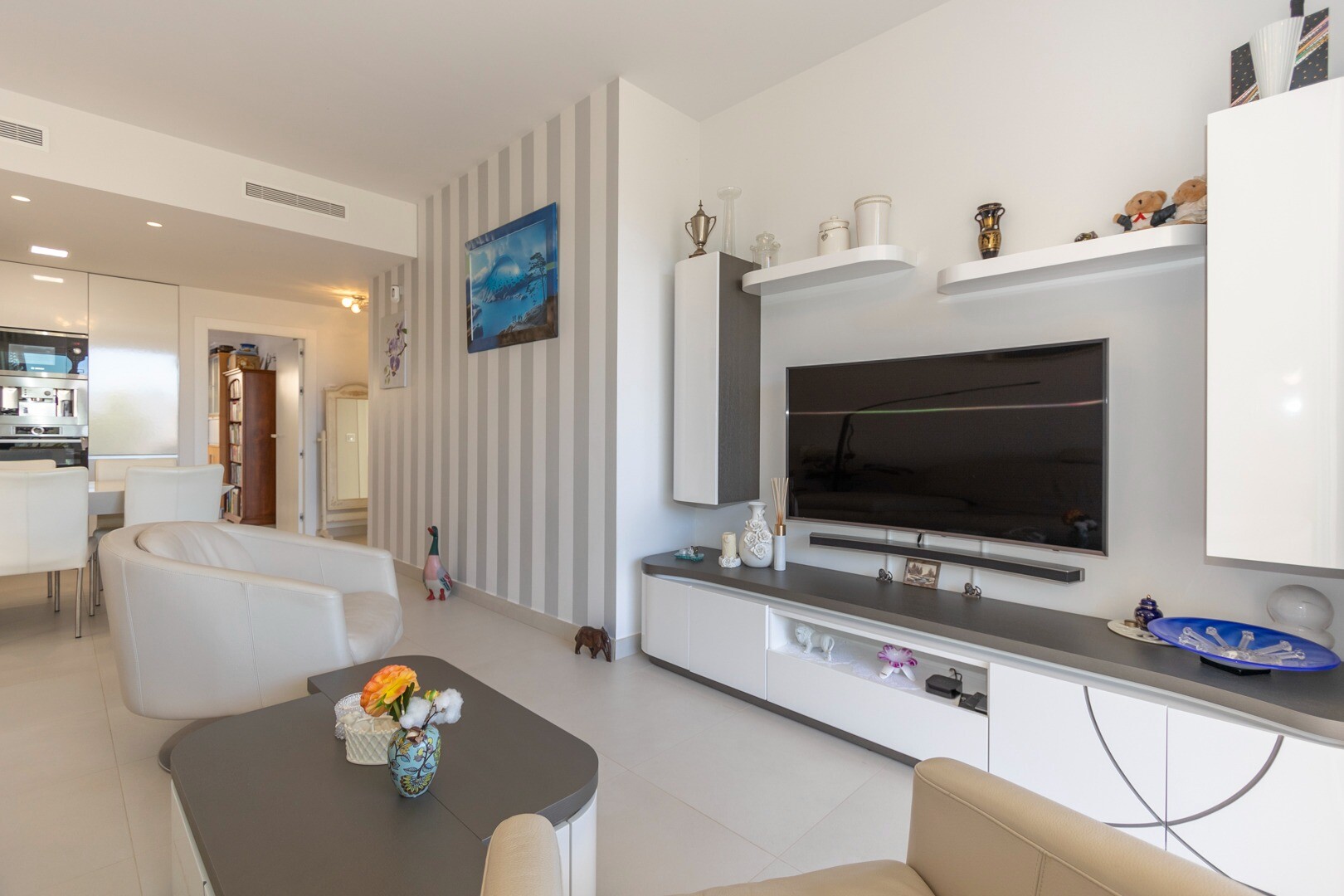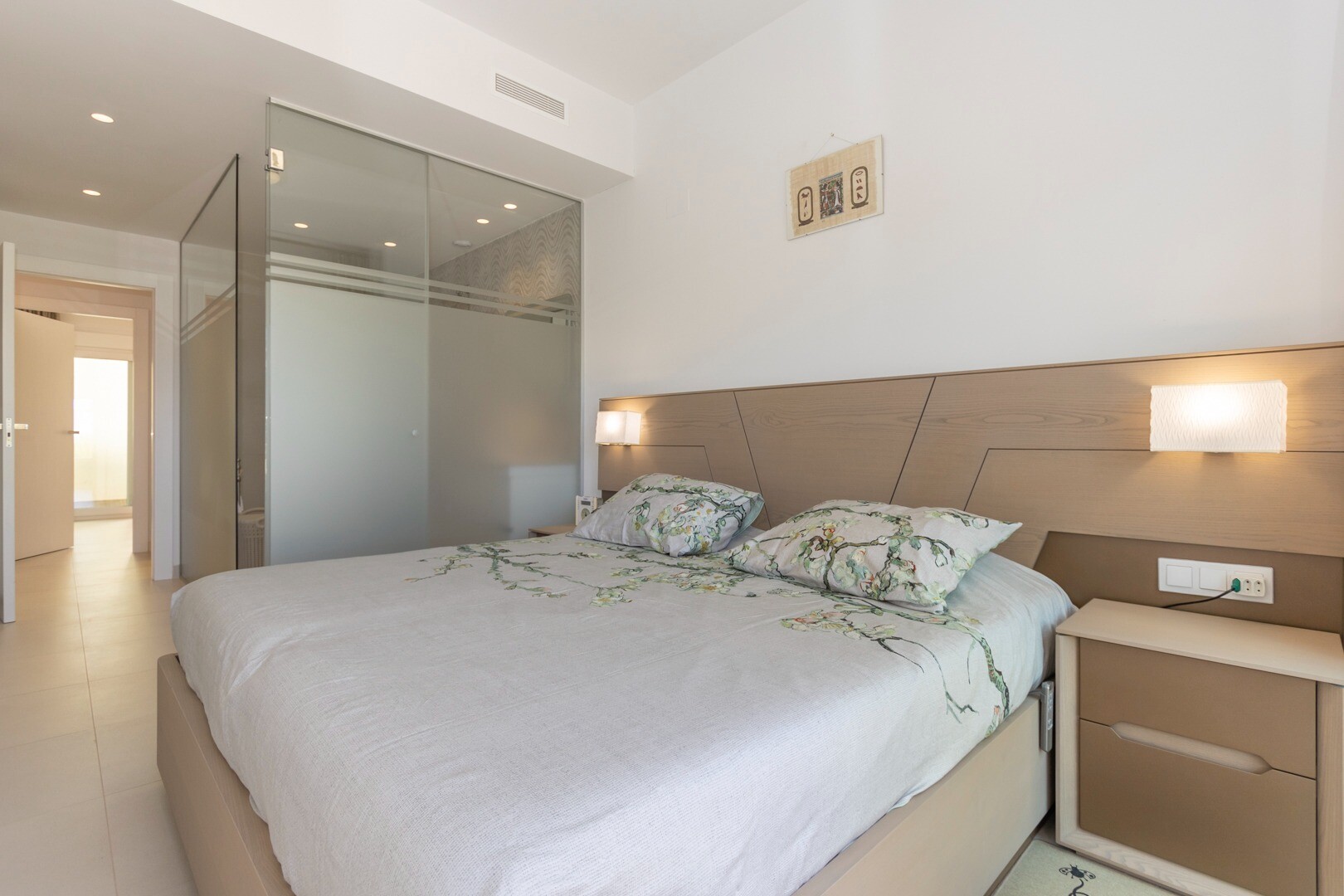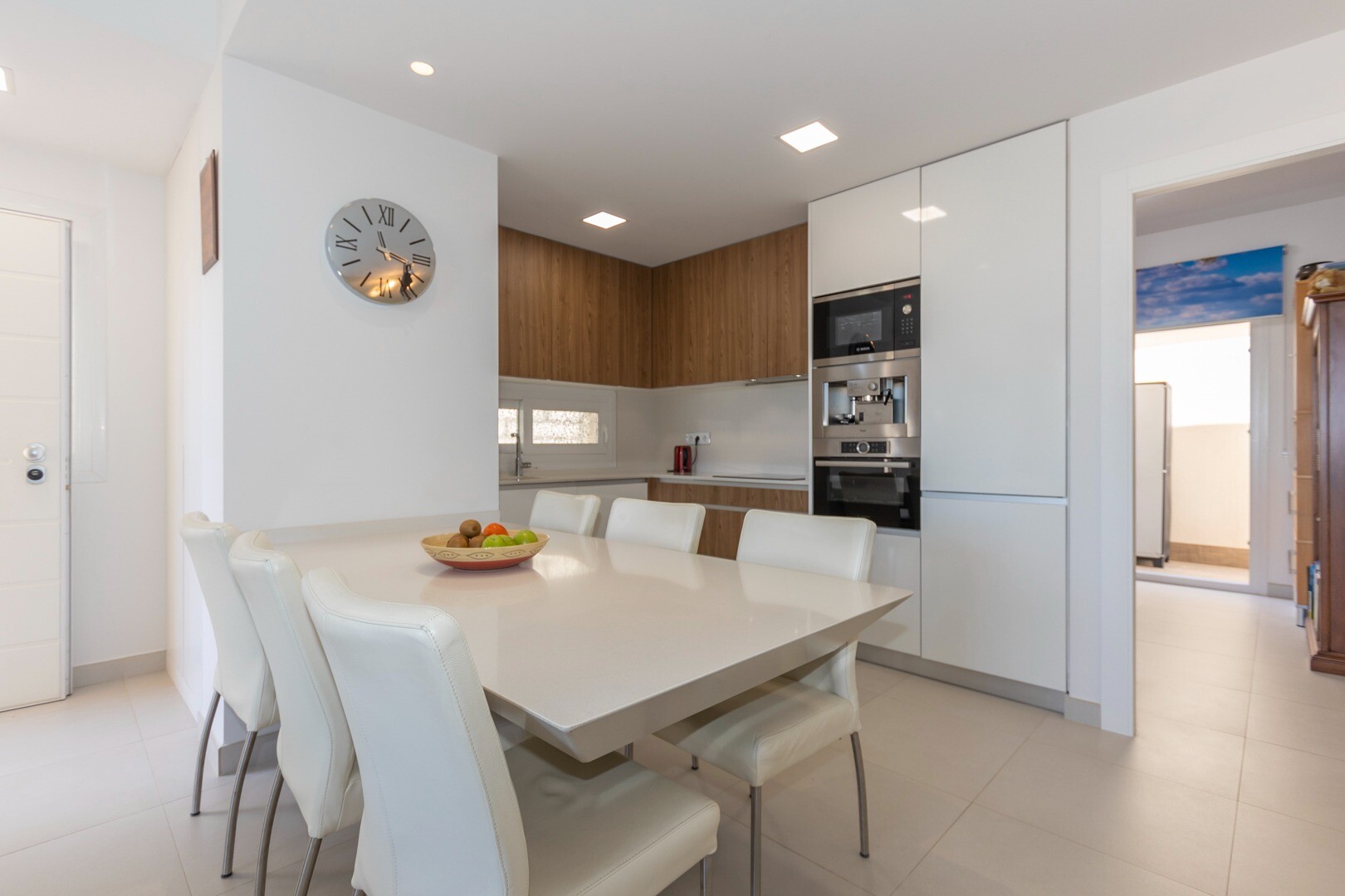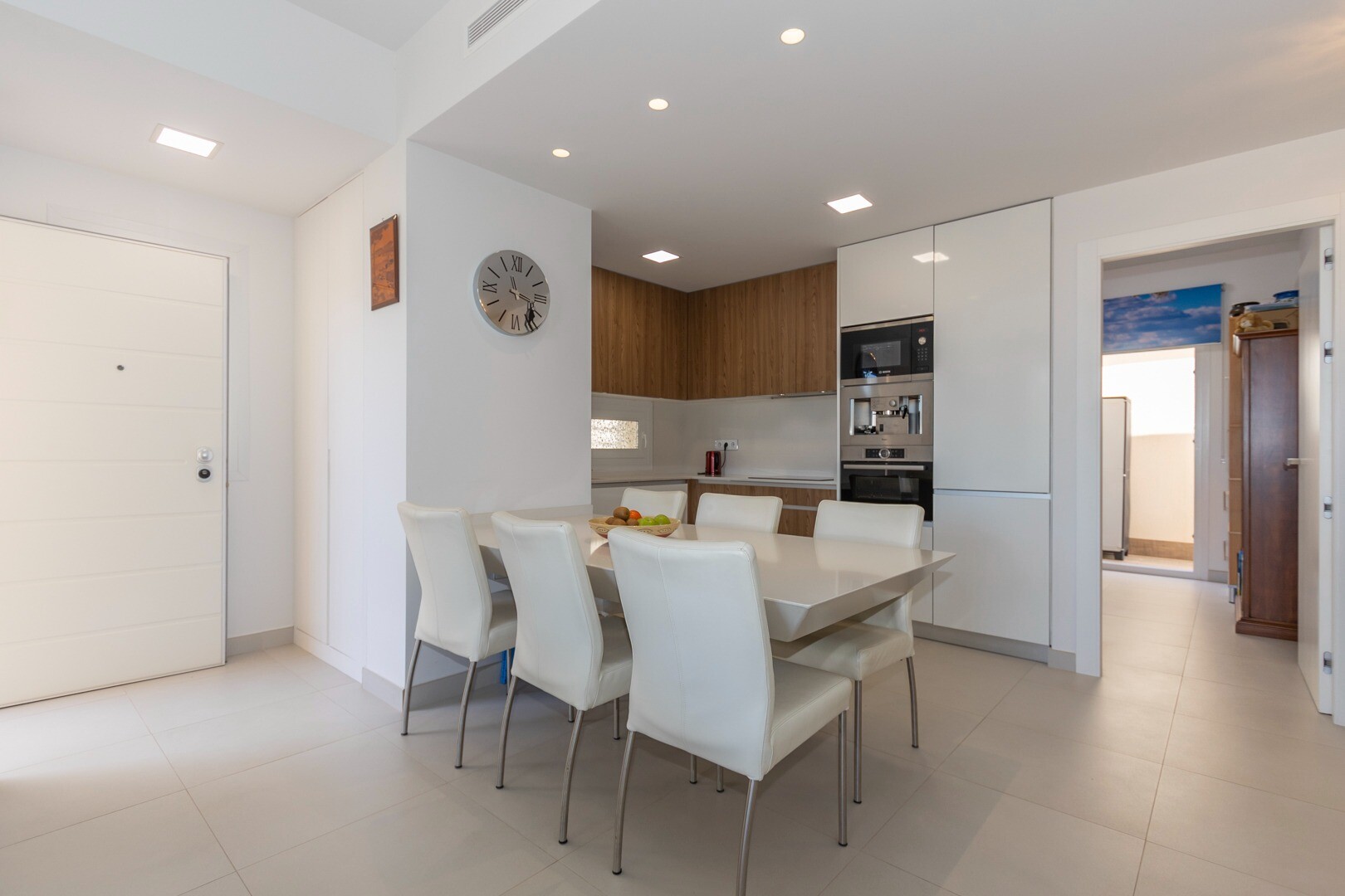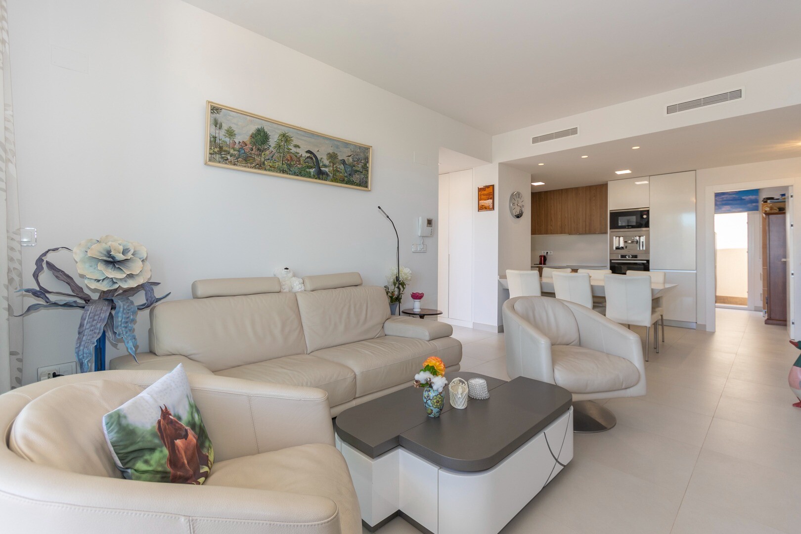 Do domu wchodzi się przez mały przedpokój, który otwiera się na duży salon i otwartą kuc...hnię z dużymi przesuwanymi szklanymi drzwiami, które otwierają się na duży taras o powierzchni 50m2. W kuchni znajdują się wszystkie udogodnienia nowoczesnej kuchni, w tym wbudowany ekspres do kawy. Mieszkanie posiada przestronne sypialnie z łazienką w głównej sypialni oraz duże przesuwane, szklane drzwi, które otwierają się na taras.