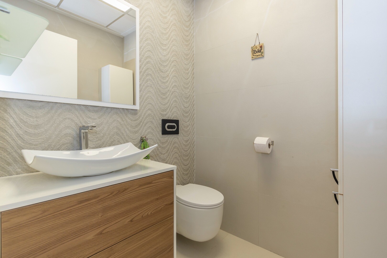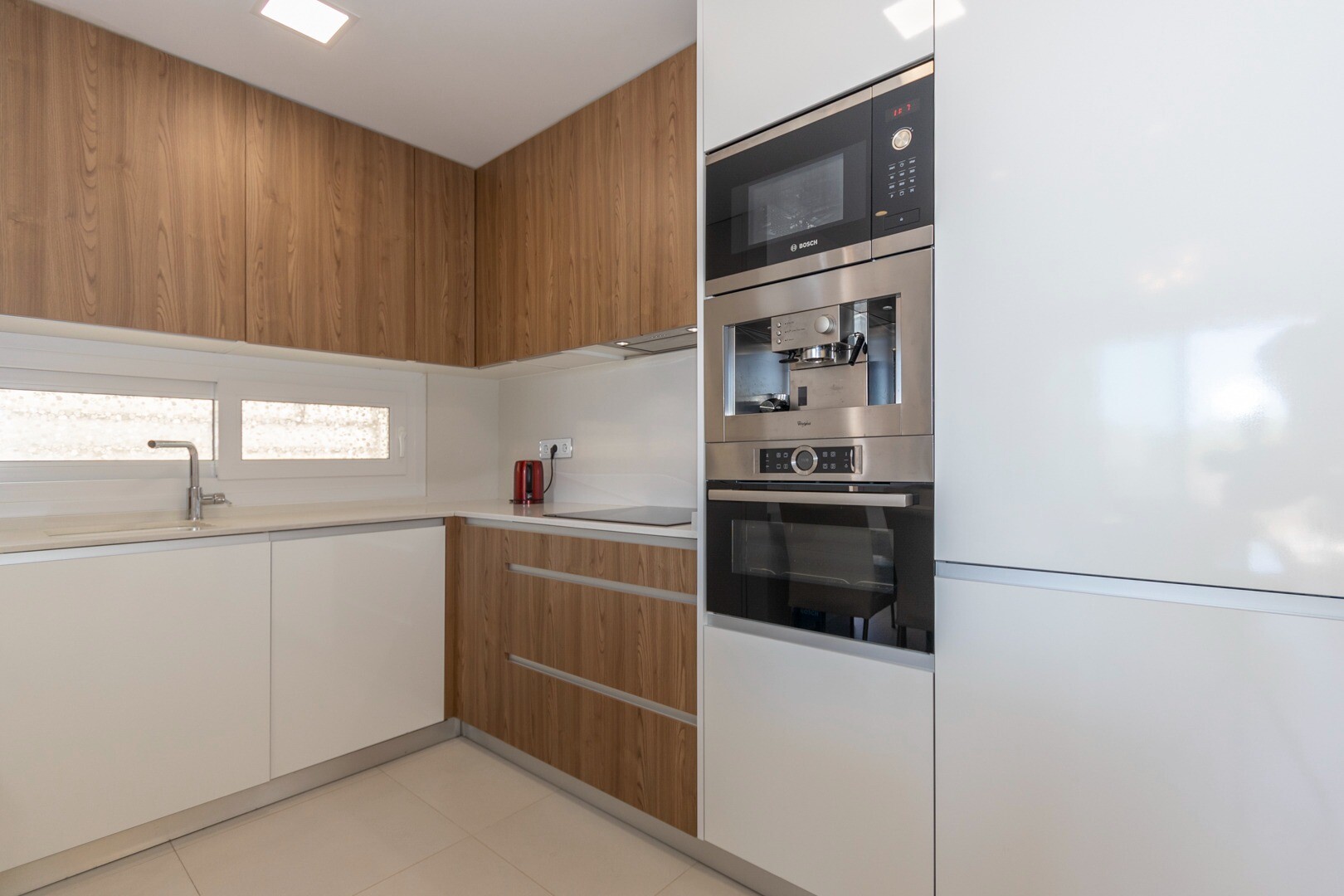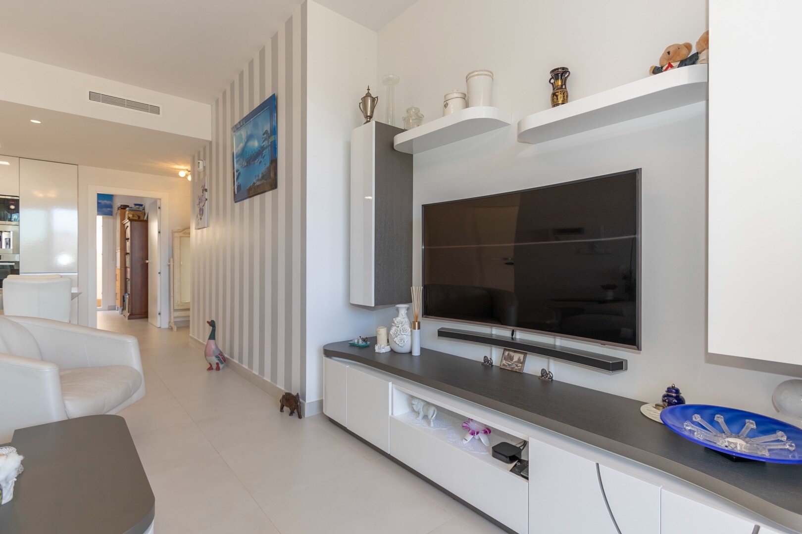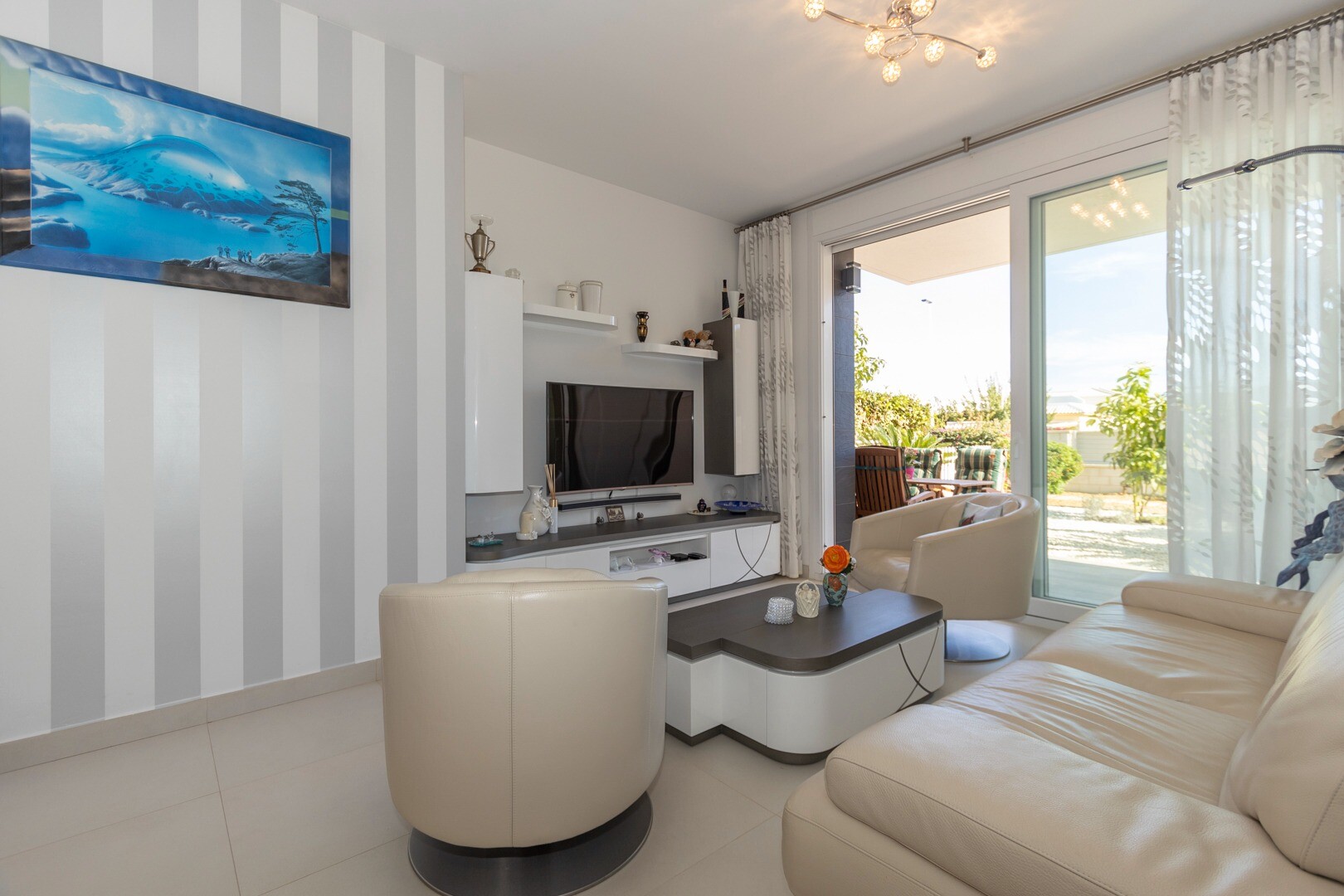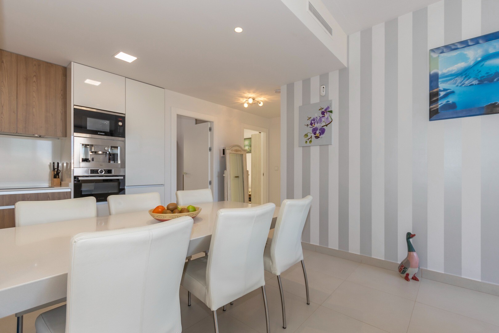 Do domu wchodzi się przez mały przedpokój, który otwiera się na duży salon i otwartą kuc...hnię z dużymi przesuwanymi szklanymi drzwiami, które otwierają się na duży taras o powierzchni 50m2. W kuchni znajdują się wszystkie udogodnienia nowoczesnej kuchni, w tym wbudowany ekspres do kawy. Mieszkanie posiada przestronne sypialnie z łazienką w głównej sypialni oraz duże przesuwane, szklane drzwi, które otwierają się na taras.