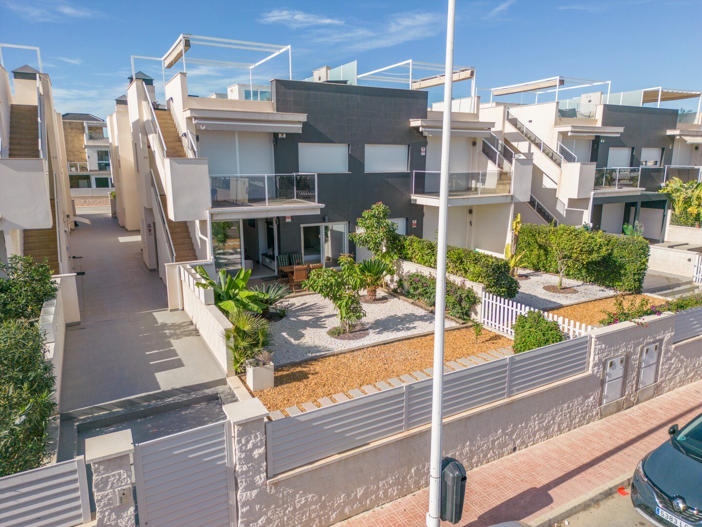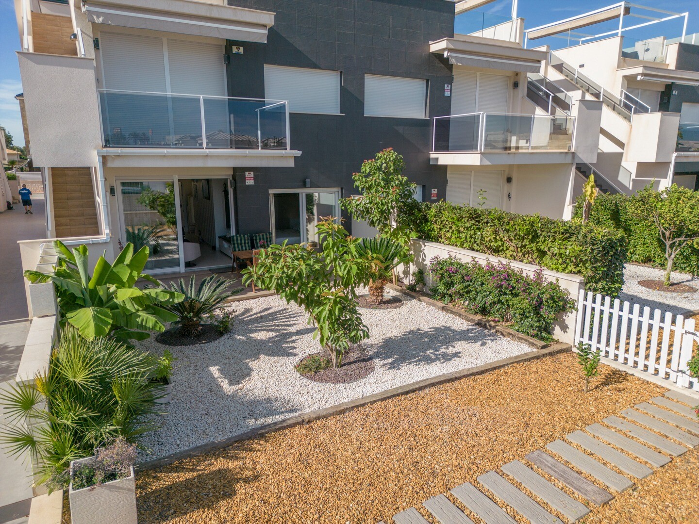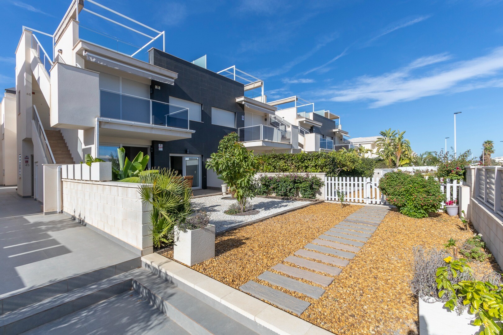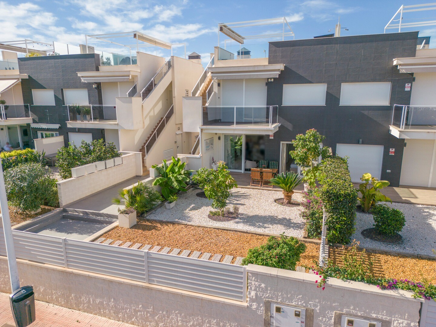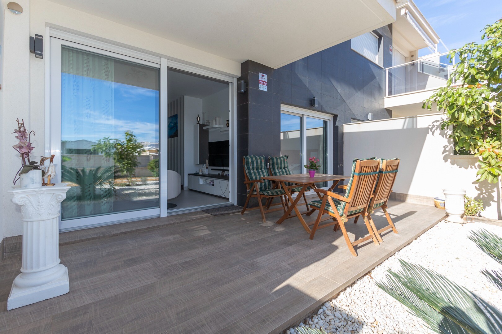 Mieszkanie posiada wbudowaną klimatyzację we wszystkich pomieszczeniach oraz ogrzewanie podłogowe. Za apartamentem znajduje się również duże patio o powierzchni 10m2, jest to przestrzeń z tyłu, która może służyć jako schowek i zapewnia naturalne światło. Front składa się z dużego tarasu i zadbanego ogrodu z różnymi roślinami i bananowcem.