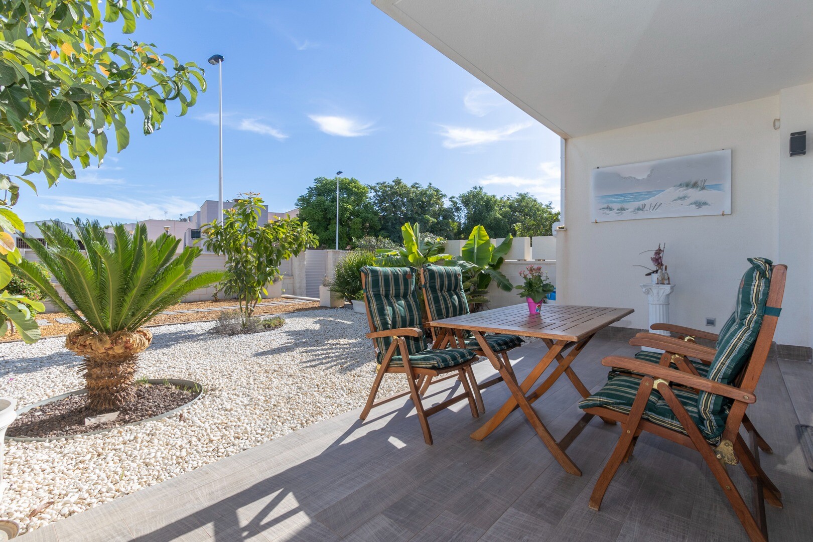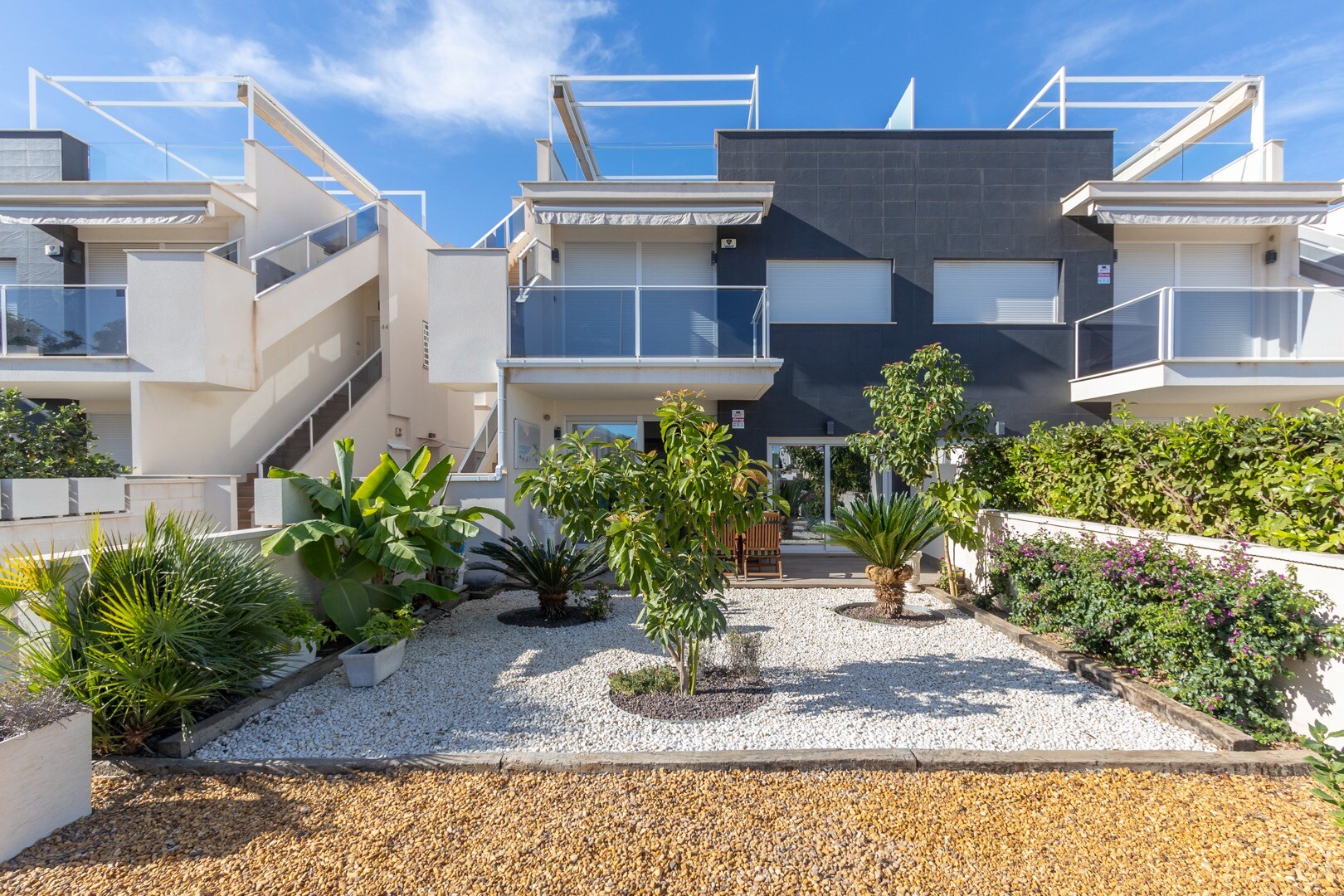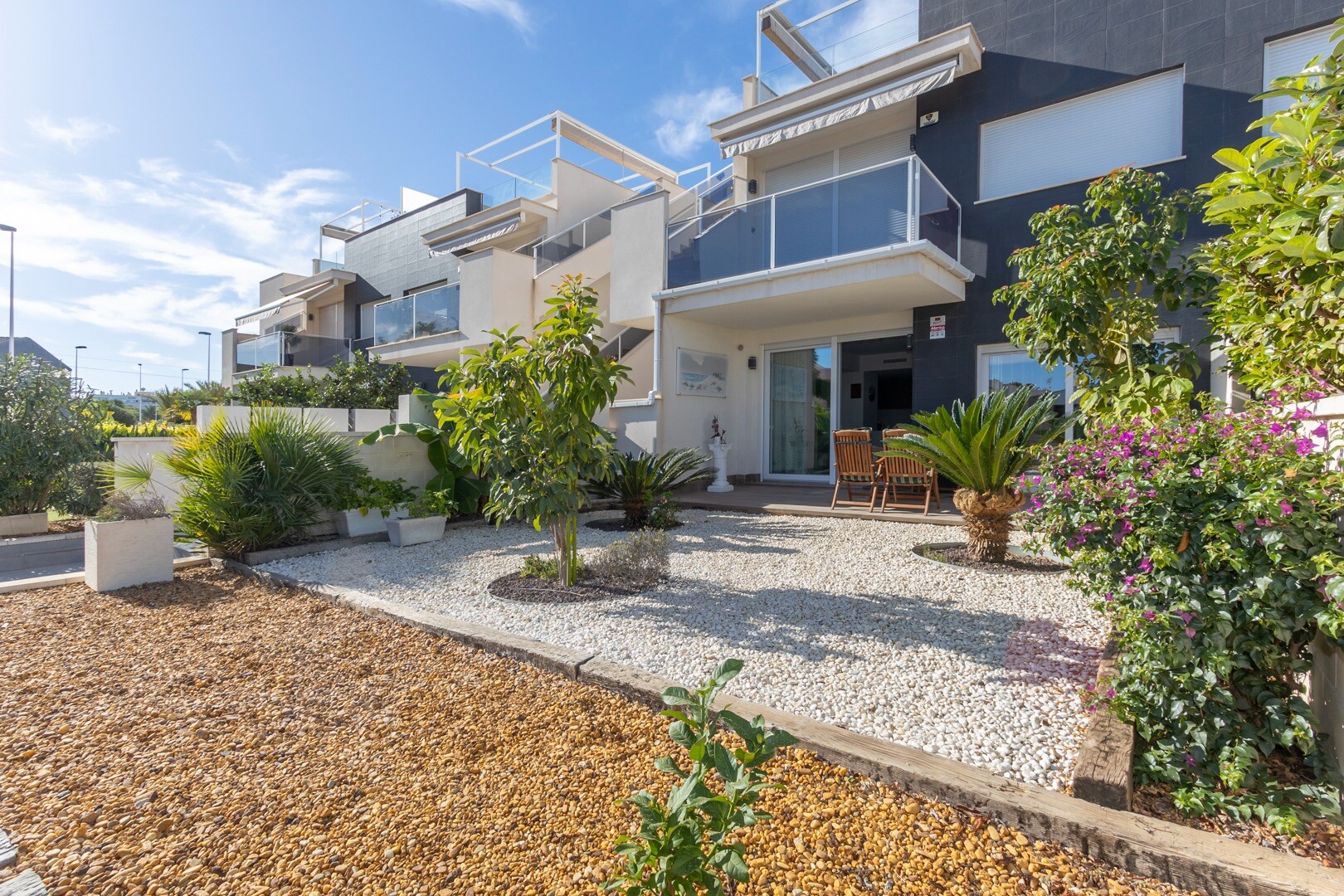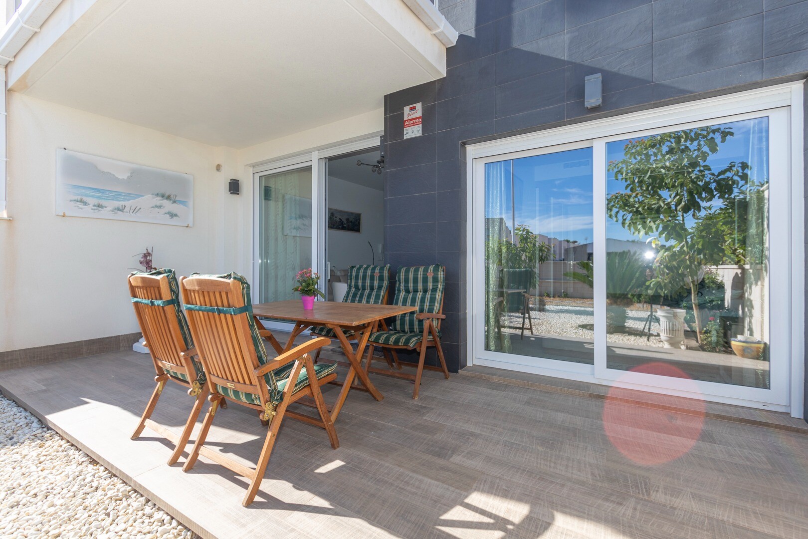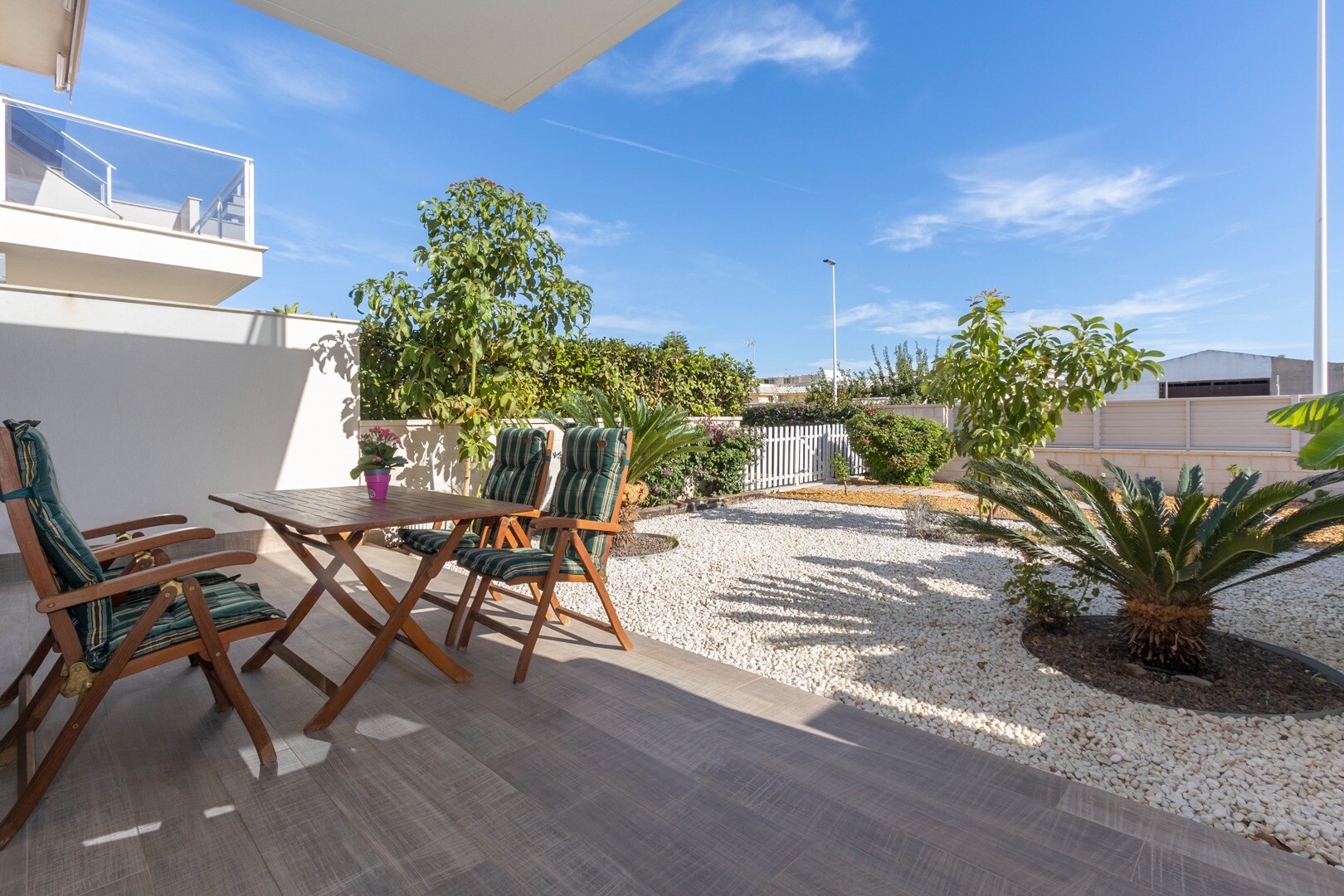 Mieszkanie posiada wbudowaną klimatyzację we wszystkich pomieszczeniach oraz ogrzewanie podłogowe. Za apartamentem znajduje się również duże patio o powierzchni 10m2, jest to przestrzeń z tyłu, która może służyć jako schowek i zapewnia naturalne światło. Front składa się z dużego tarasu i zadbanego ogrodu z różnymi roślinami i bananowcem.