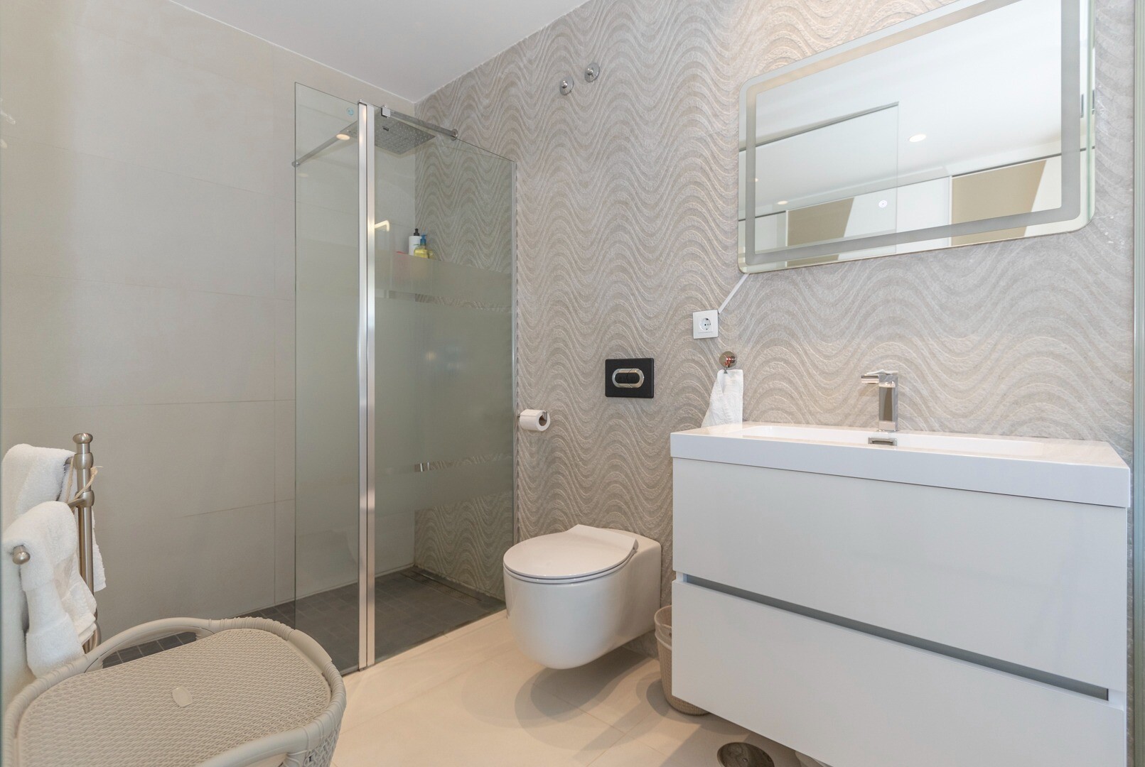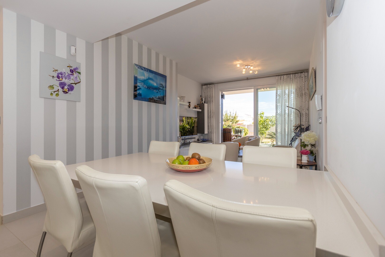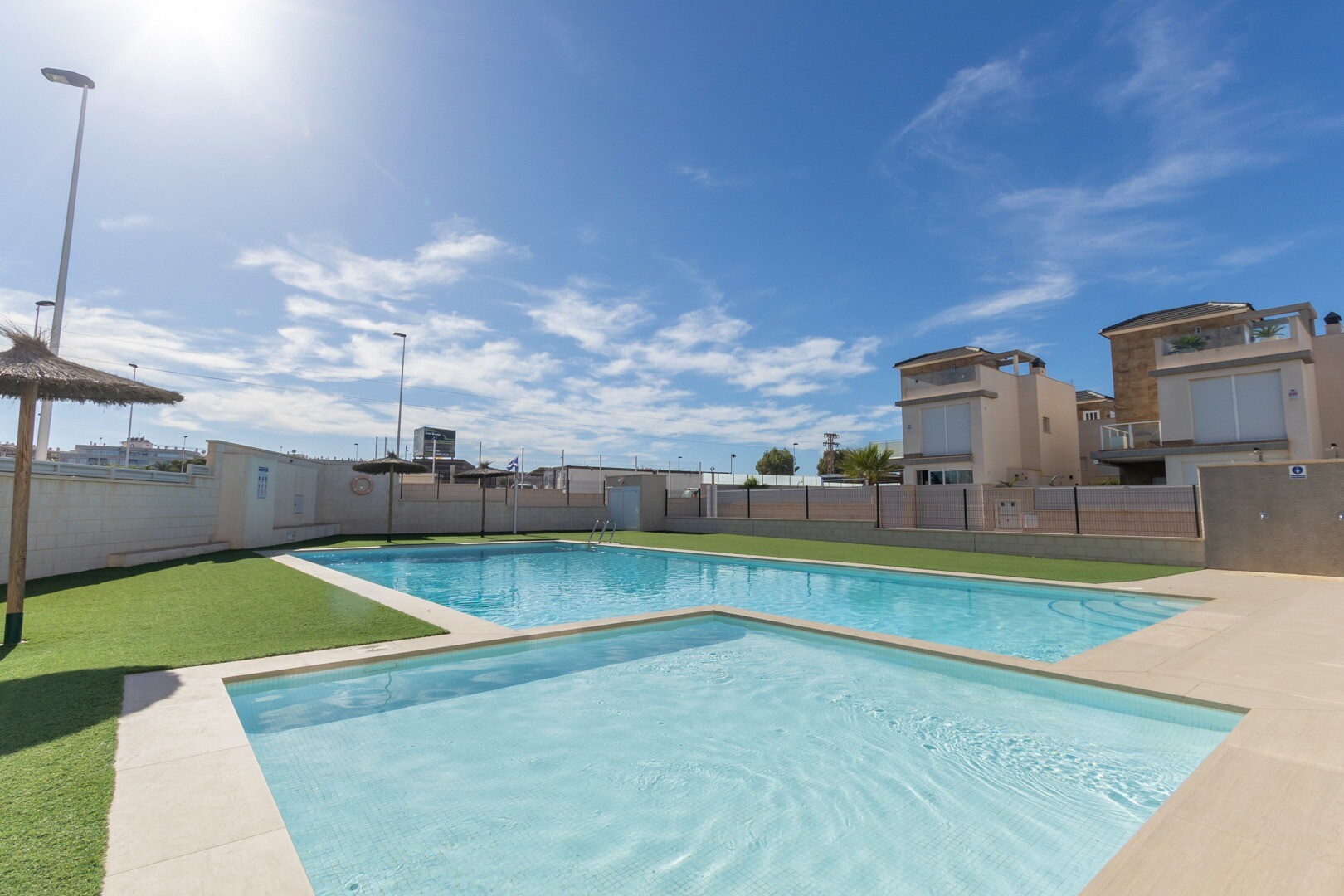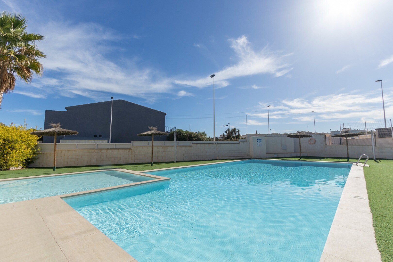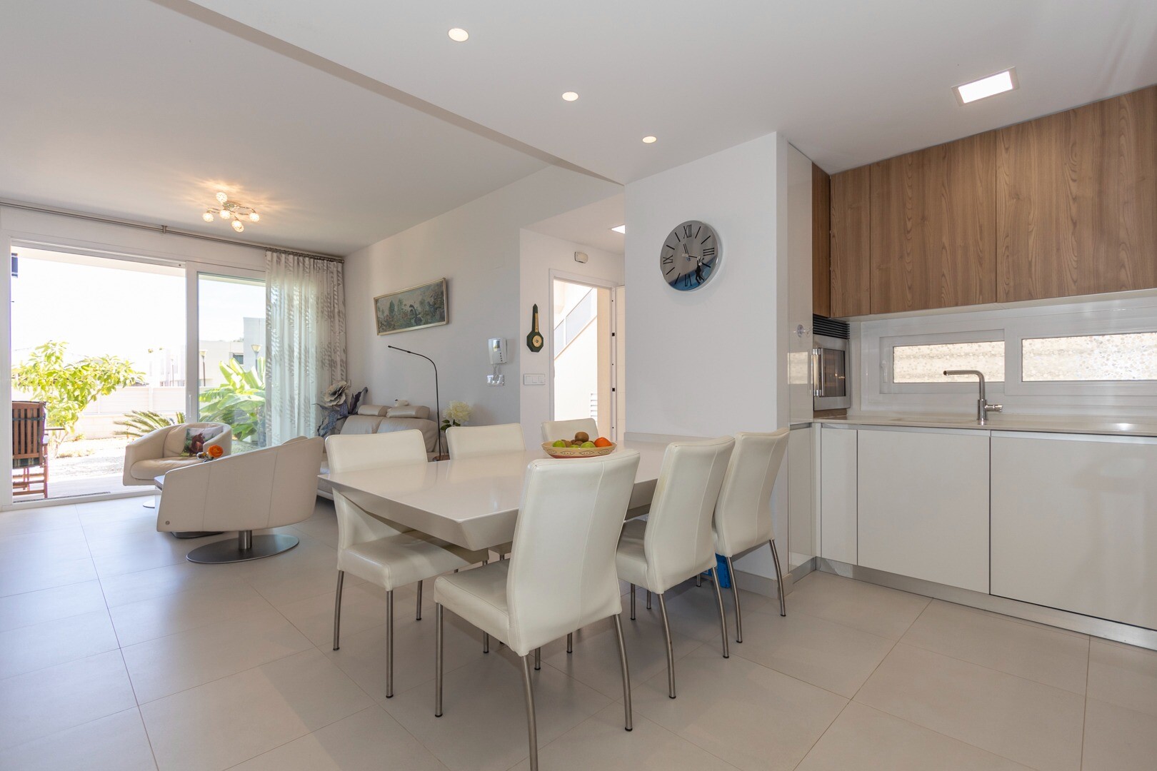 Mieszkanie posiada wbudowaną klimatyzację we wszystkich pomieszczeniach oraz ogrzewanie podłogowe. Za apartamentem znajduje się również duże patio o powierzchni 10m2, jest to przestrzeń z tyłu, która może służyć jako schowek i zapewnia naturalne światło. Front składa się z dużego tarasu i zadbanego ogrodu z różnymi roślinami i bananowcem.