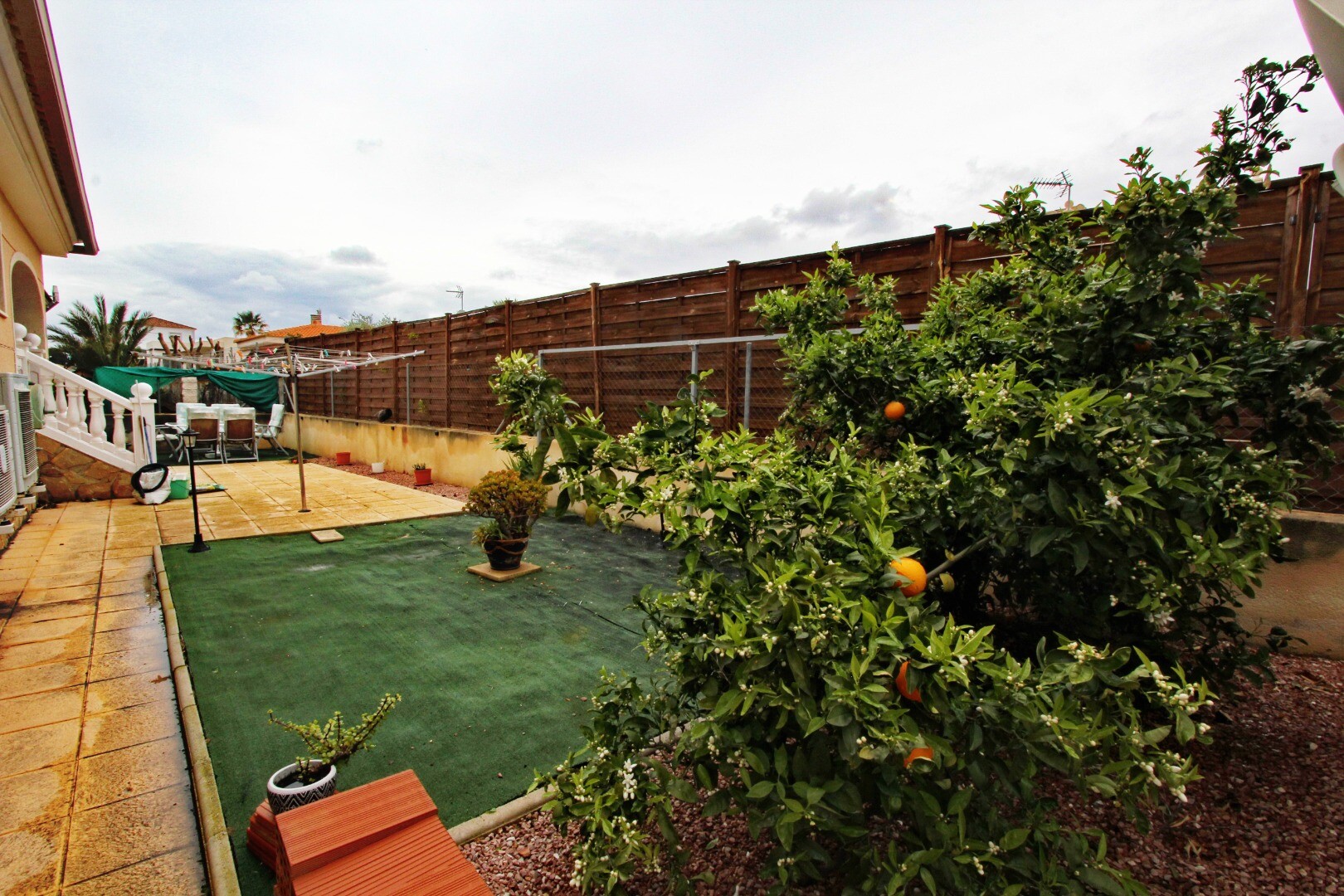 Z tyłu nieruchomości znajduje się dodatkowa przestrzeń zewnętrzna, w tym drzewa owocowe, suszarnia i mały ganek — idealne miejsce do spędzania czasu na świeżym powietrzu i relaksu.