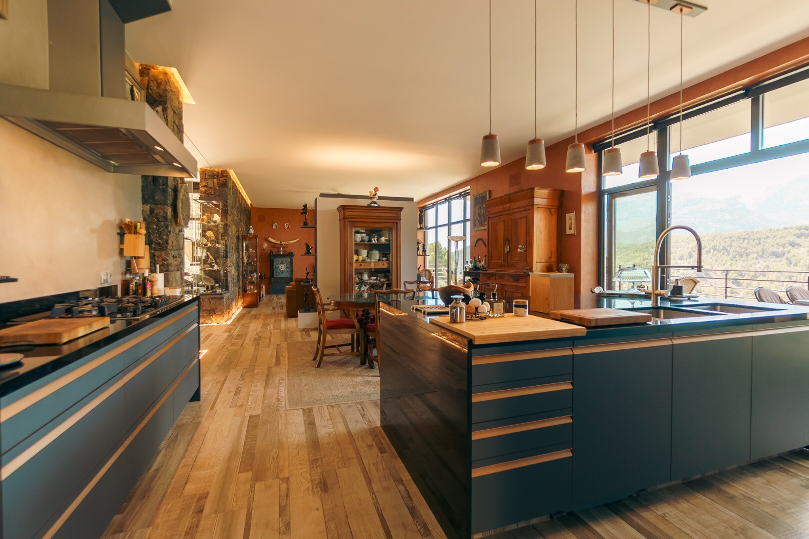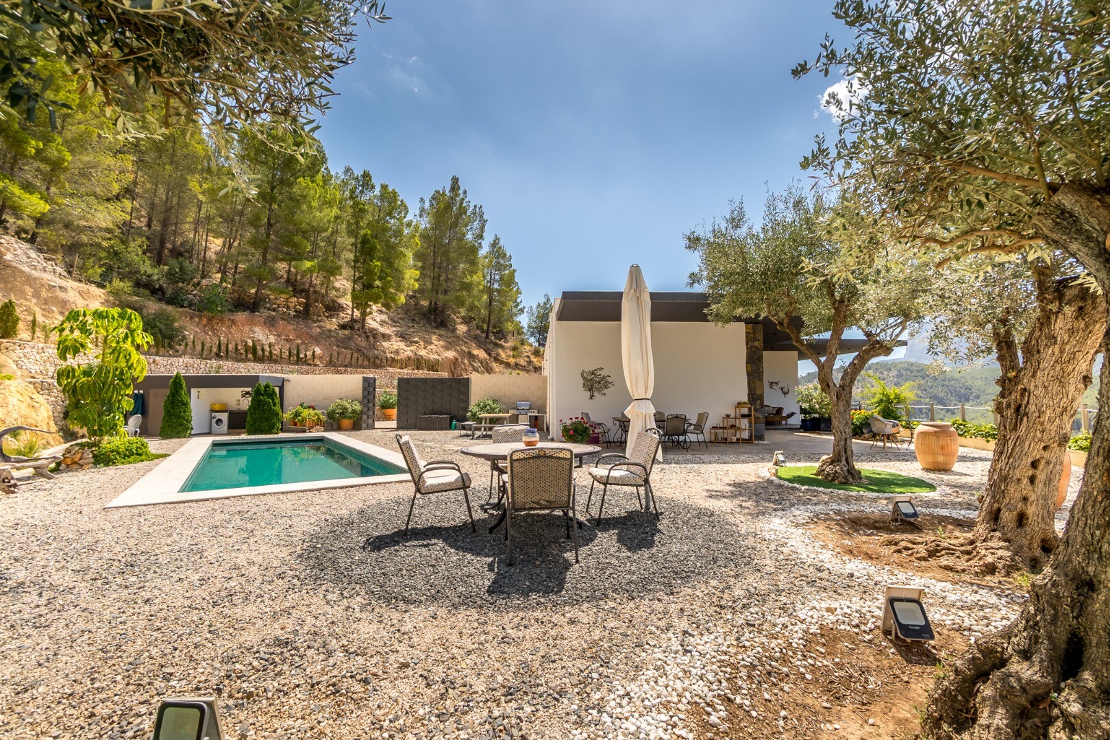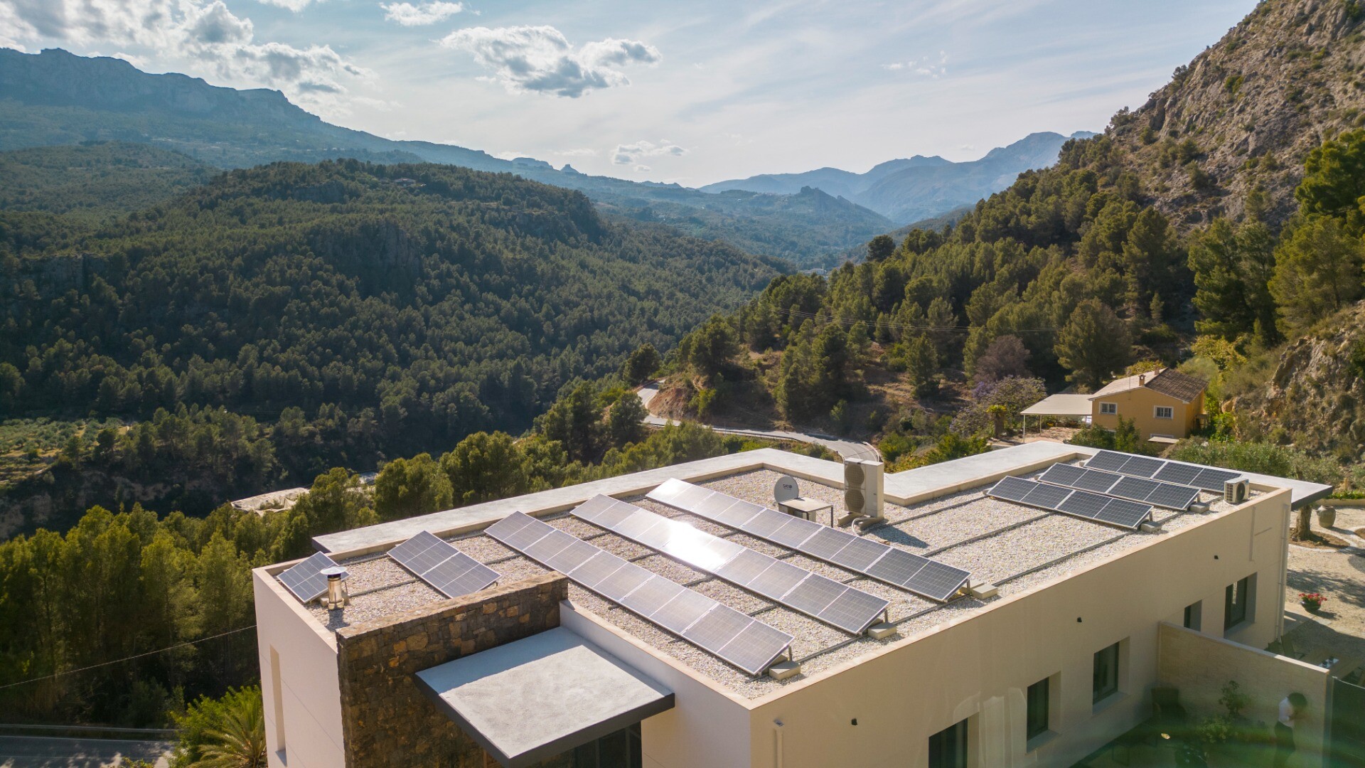 Posiadłość otaczają tarasy, w tym imponujący, 3,3-metrowy taras wspornikowy, wysunięty w stronę doliny. Z tego punktu widokowego rozciąga się widok na łagodne, zielone góry w kierunku Guadalest, tworząc niezwykłe poczucie otwartości i spokoju.
