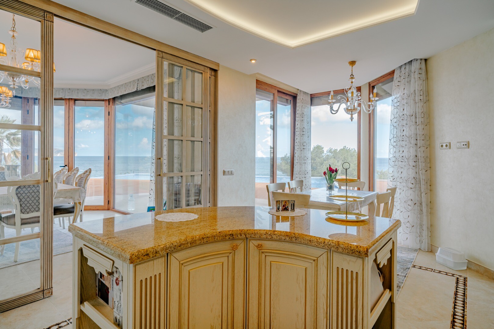 Położona na podwójnej działce willa gwarantuje pełną prywatność i przestrzeń, a także oferuje przestronne tarasy z widokiem na morze — idealne do korzystania z śródziemnomorskiego klimatu przez cały rok.
