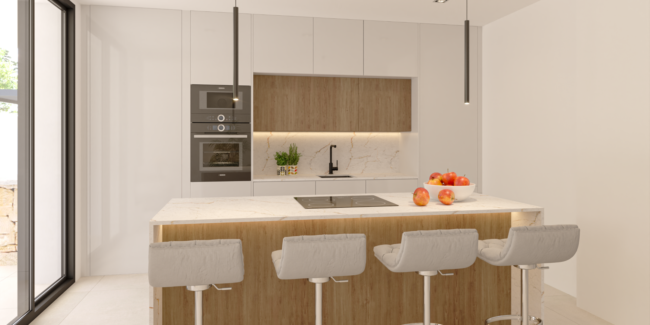 Komfortowy i przytulny parter oferuje dużą powierzchnię użytkową 178,50 m², starannie zaprojektowaną z myślą o zapewnieniu wygodnego codziennego życia. Przestronny salon z jadalnią, kuchnia i galeria dopełniają dzienną przestrzeń mieszkalną z bezpośrednim dostępem do strefy wypoczynkowej oraz ogrodu, basenu i grilla. Na piętrze, o powierzchni 123,90 m², znajdują się dwie sypialnie z łazienkami i taras bioklimatyczny. Z tyłu znajduje się idealnie zaprojektowany taras słoneczny ze szklaną balustradą.
