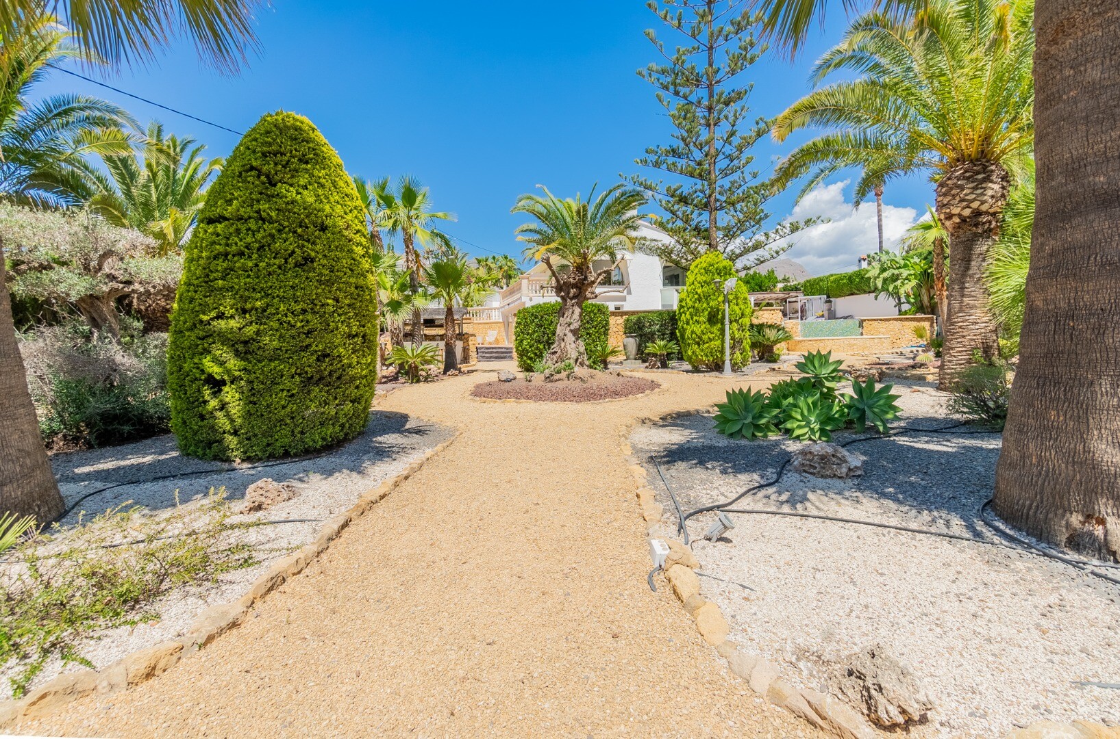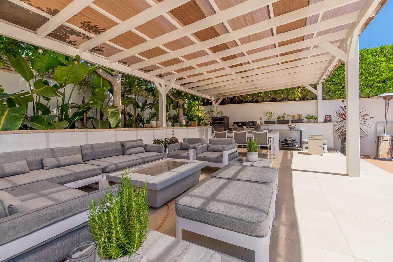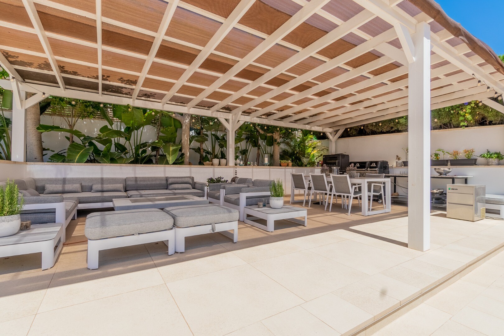 - **Ogród Tropikalny:** Położony na niższej działce ogród to tropikalny raj z palmami, oświetleniem nocnym, kilkoma strefami relaksu i częścią barową z systemem nagłośnienia i oświetlenia wkomponowaną wśród bujnej roślinności. Egzotycznego akcentu dodaje jacuzzi z piaskiem plażowym.