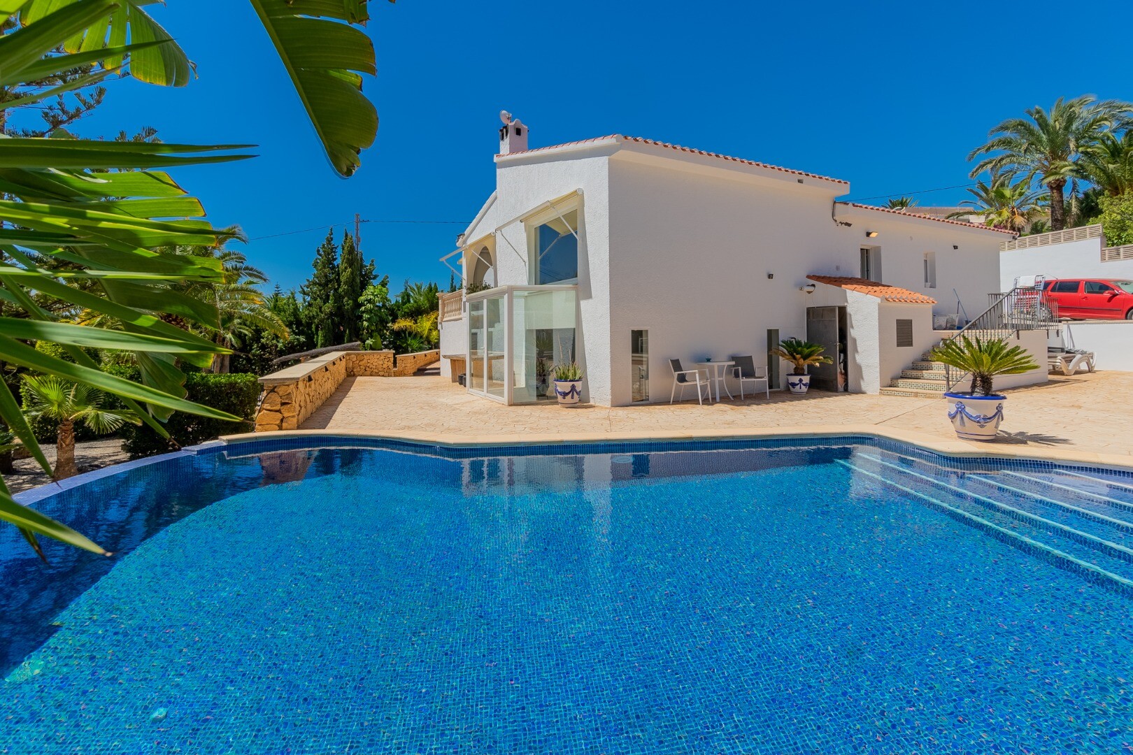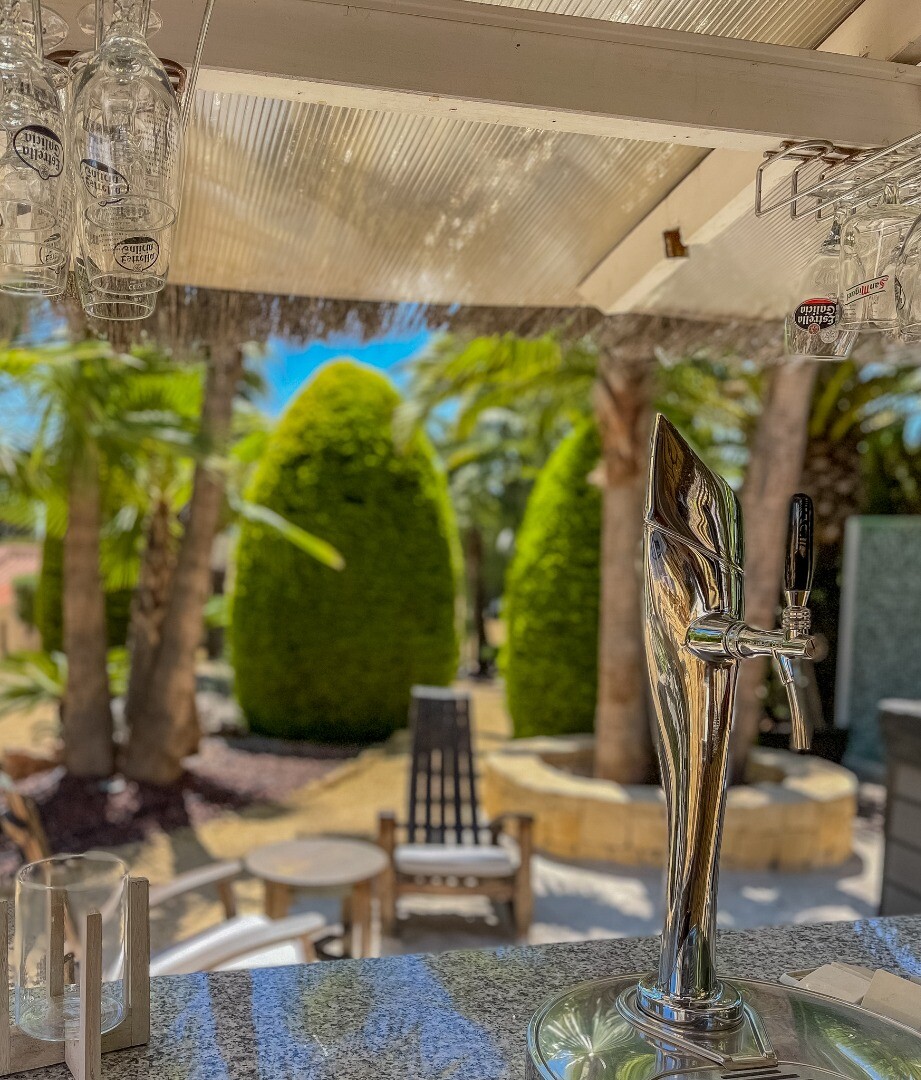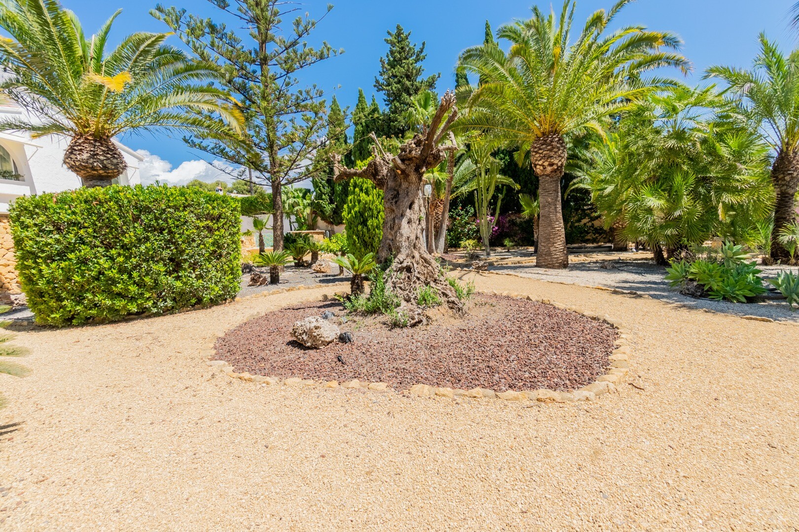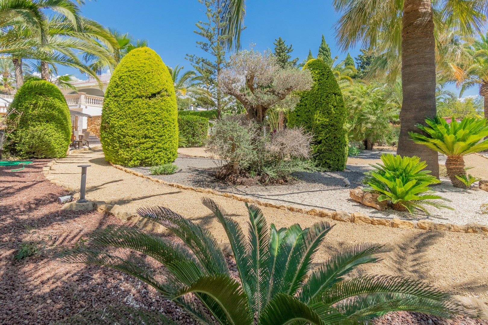 - **Ogród Tropikalny:** Położony na niższej działce ogród to tropikalny raj z palmami, oświetleniem nocnym, kilkoma strefami relaksu i częścią barową z systemem nagłośnienia i oświetlenia wkomponowaną wśród bujnej roślinności. Egzotycznego akcentu dodaje jacuzzi z piaskiem plażowym.