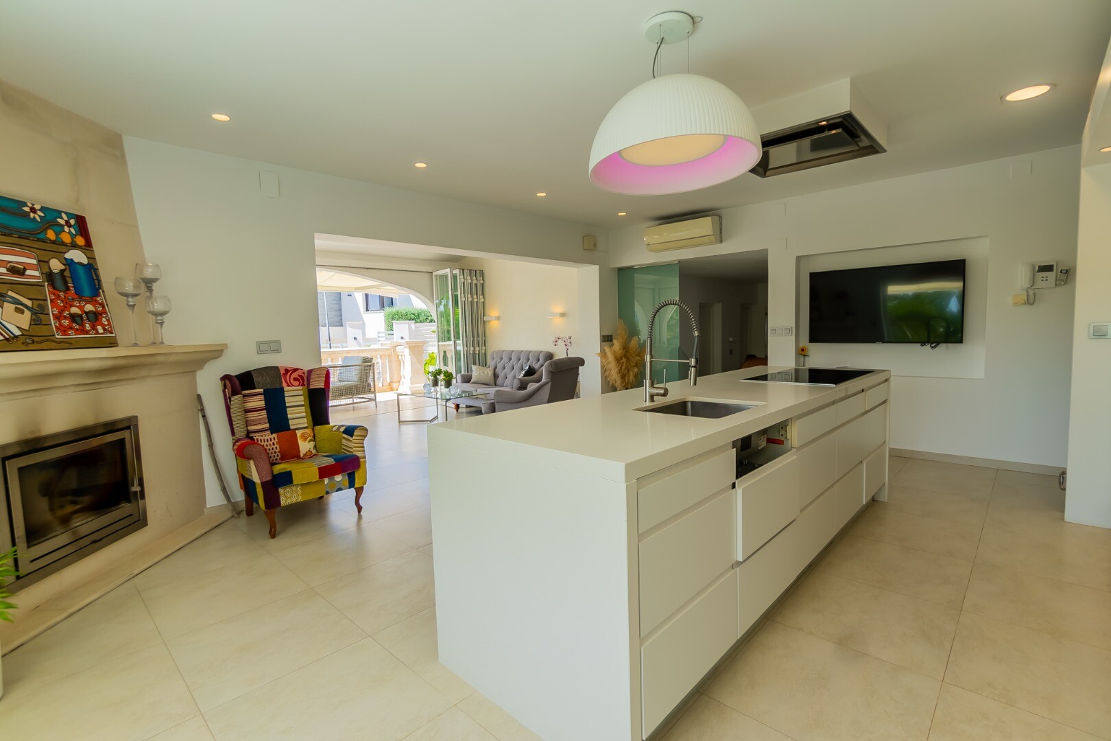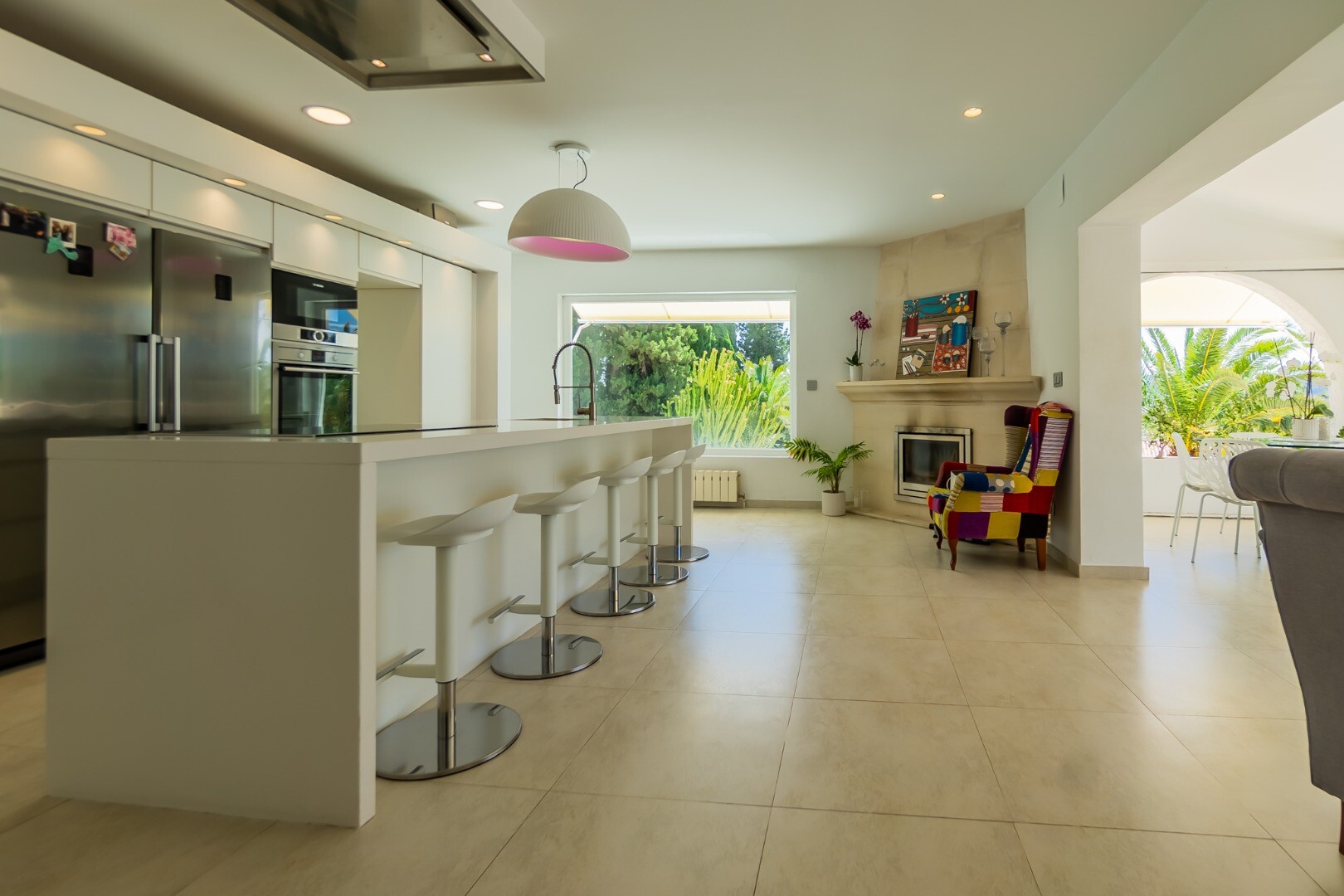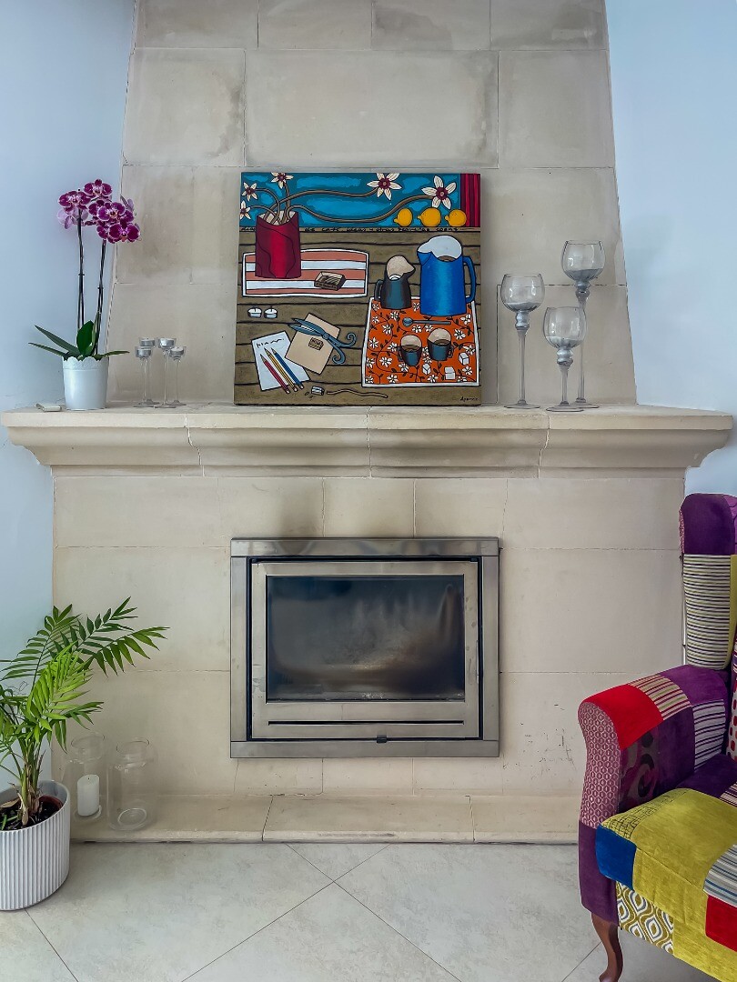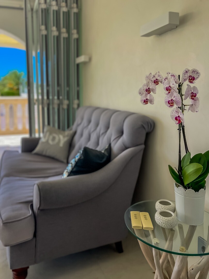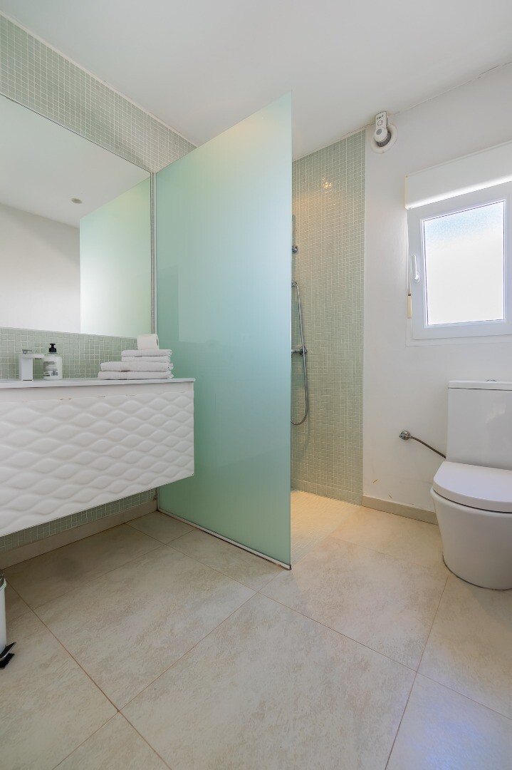 - **Dom Główny:** Ta piękna willa znajduje się... na górnej działce i posiada 3 sypialnie z nowymi szafami wnękowymi oraz 2 nowoczesne łazienki z ogrzewaniem podłogowym. Otwarta koncepcja amerykańskiej kuchni obejmuje centralną wyspę z biało-kremowym blatem Silestone, który idealnie komponuje się z salonem, w którym znajduje się przytulny kominek i duże okna wychodzące na południe, w których można łapać zimowe światło słoneczne.