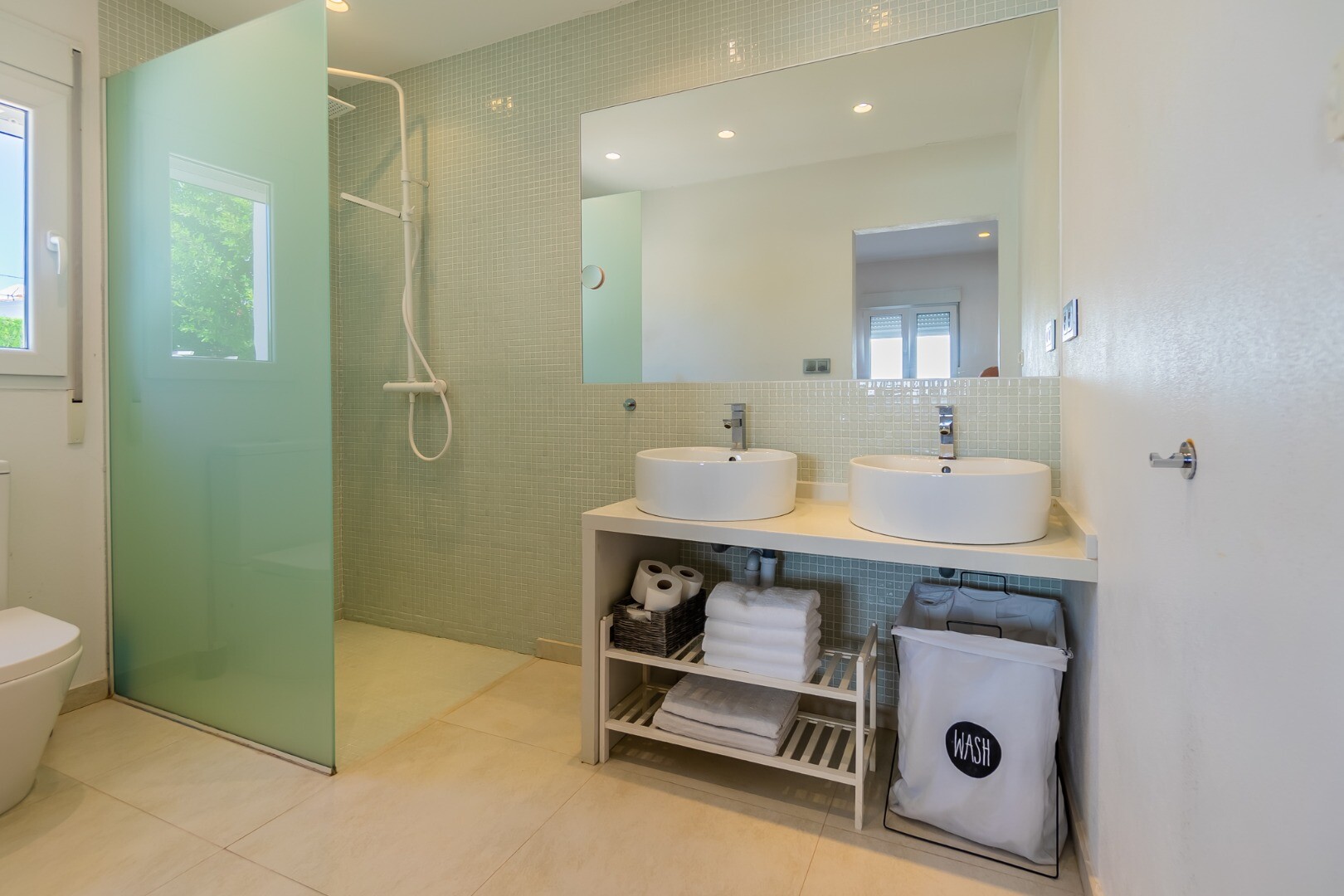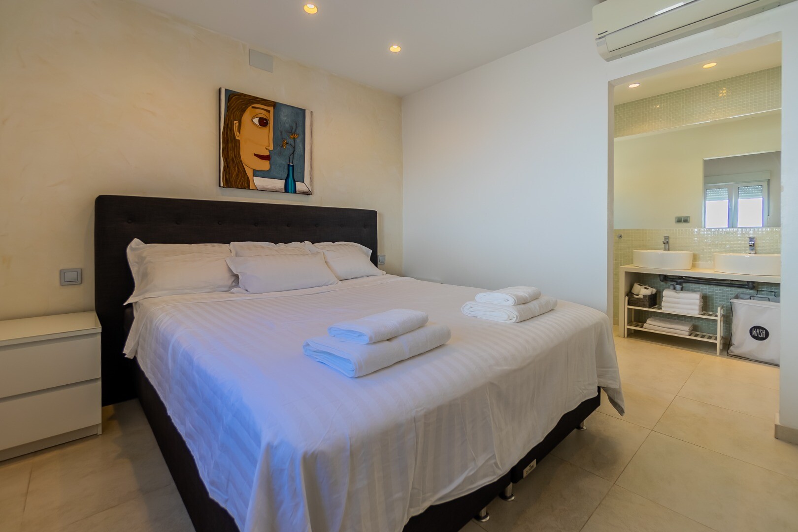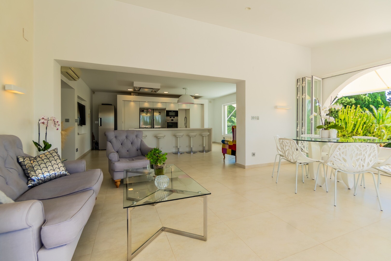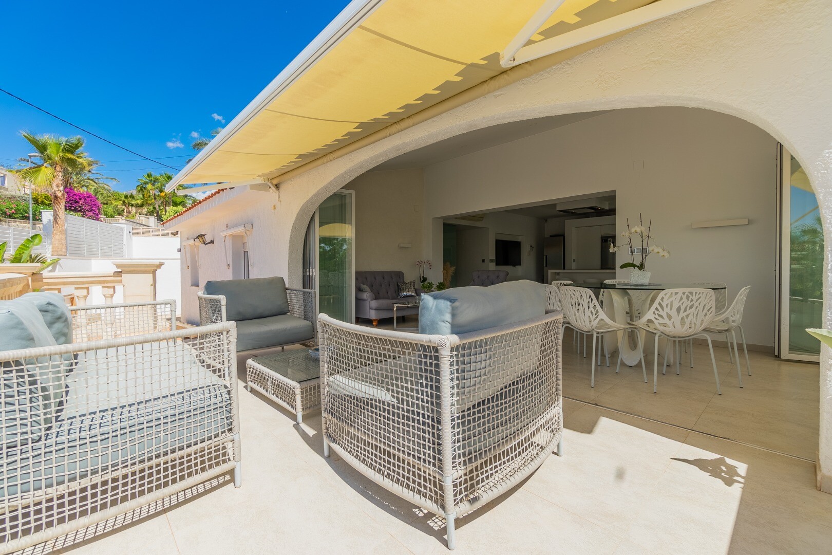 - **Dom Główny:** Ta piękna willa znajduje się... na górnej działce i posiada 3 sypialnie z nowymi szafami wnękowymi oraz 2 nowoczesne łazienki z ogrzewaniem podłogowym. Otwarta koncepcja amerykańskiej kuchni obejmuje centralną wyspę z biało-kremowym blatem Silestone, który idealnie komponuje się z salonem, w którym znajduje się przytulny kominek i duże okna wychodzące na południe, w których można łapać zimowe światło słoneczne.