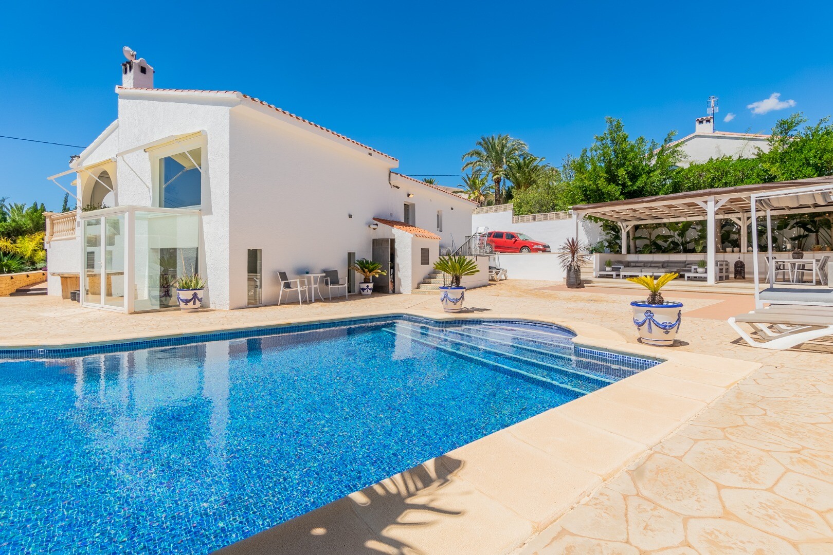 - **Obszar basenowy:** Prywatny, słoneczny obszar basenowy z drukowanym betonem, pergolą o wymiarach 10x10m i basenem typu infinity z systemem powrotu wody.