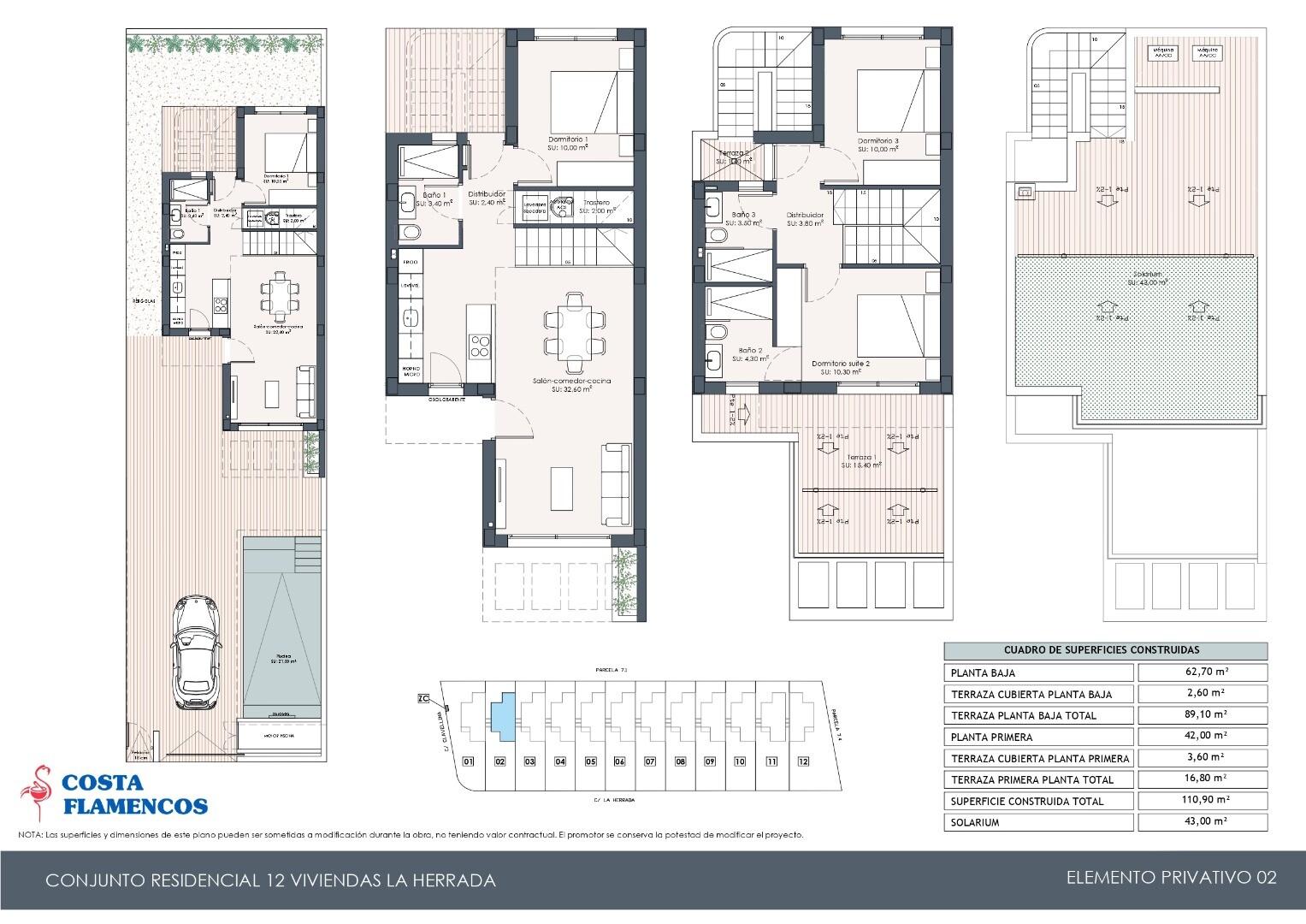 Basen o wymiarach 7 x 3 m ma wodospad z częścią wypoczynkową z jacuzzi i prysznicem na świeżym powietrzu. Wille wyposażone są w solarium na dachu z widokiem na słone jeziora Torrevieja.W pełni wyposażone łazienki z ogrzewaniem podłogowym i oświetleniem wnętrz.
