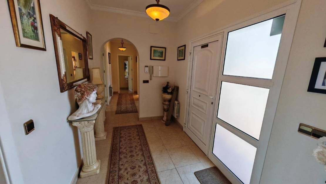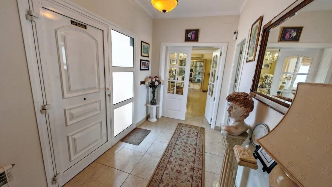 Eleganckie wnętrza: Przestronny hol wejściowy zaprasza do willi, łącząc ją z w pełni wyposażoną kuchnią, jasnym salonem i dwiema z czterech sypialni.