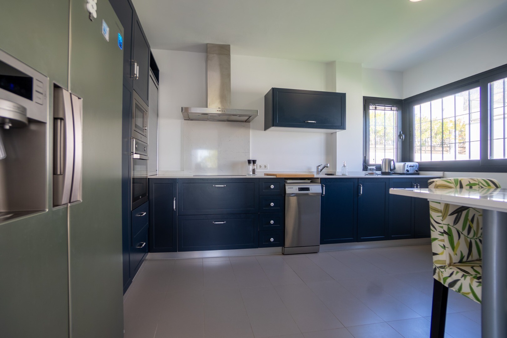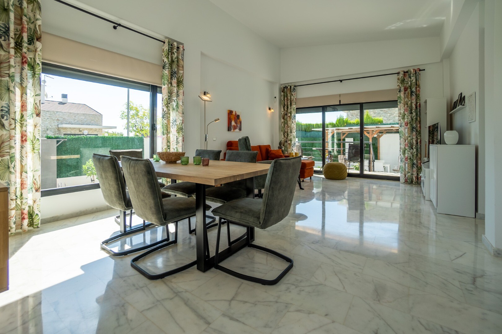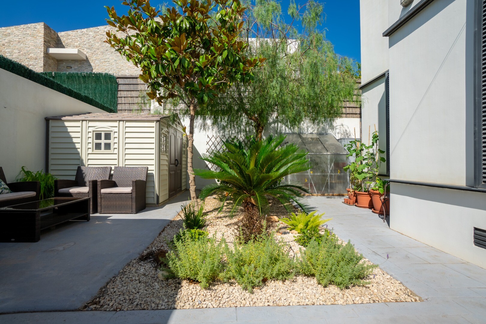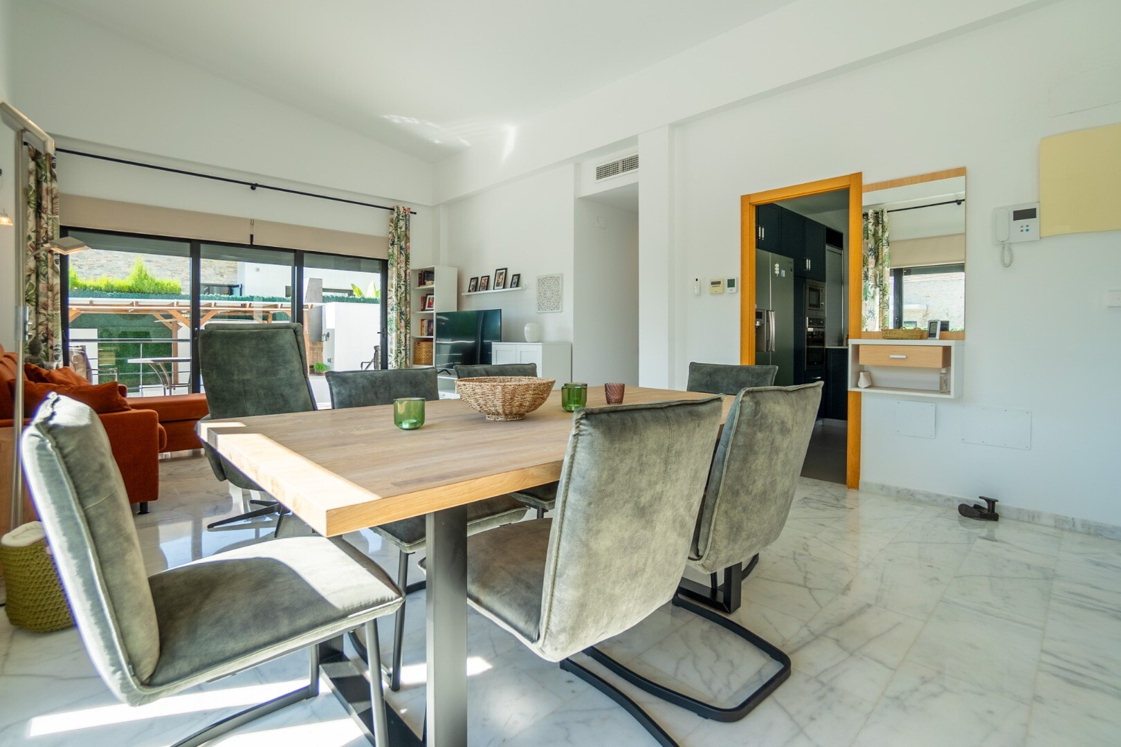 Duże okna wpuszczają naturalne światło do całego domu, tworząc przytulną atmosferę. Na zewnątrz znajduje się prywatny basen, niewymagający konserwacji ogród z oranżerią, zadaszona jadalnia na świeżym powietrzu z grillem, duży schowek/pralnia, dodatkowa szafa do przechowywania i miejsce parkingowe na działce.