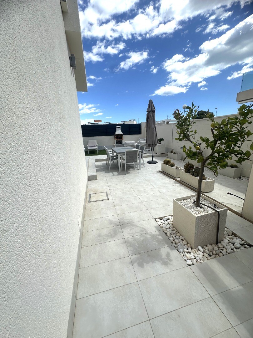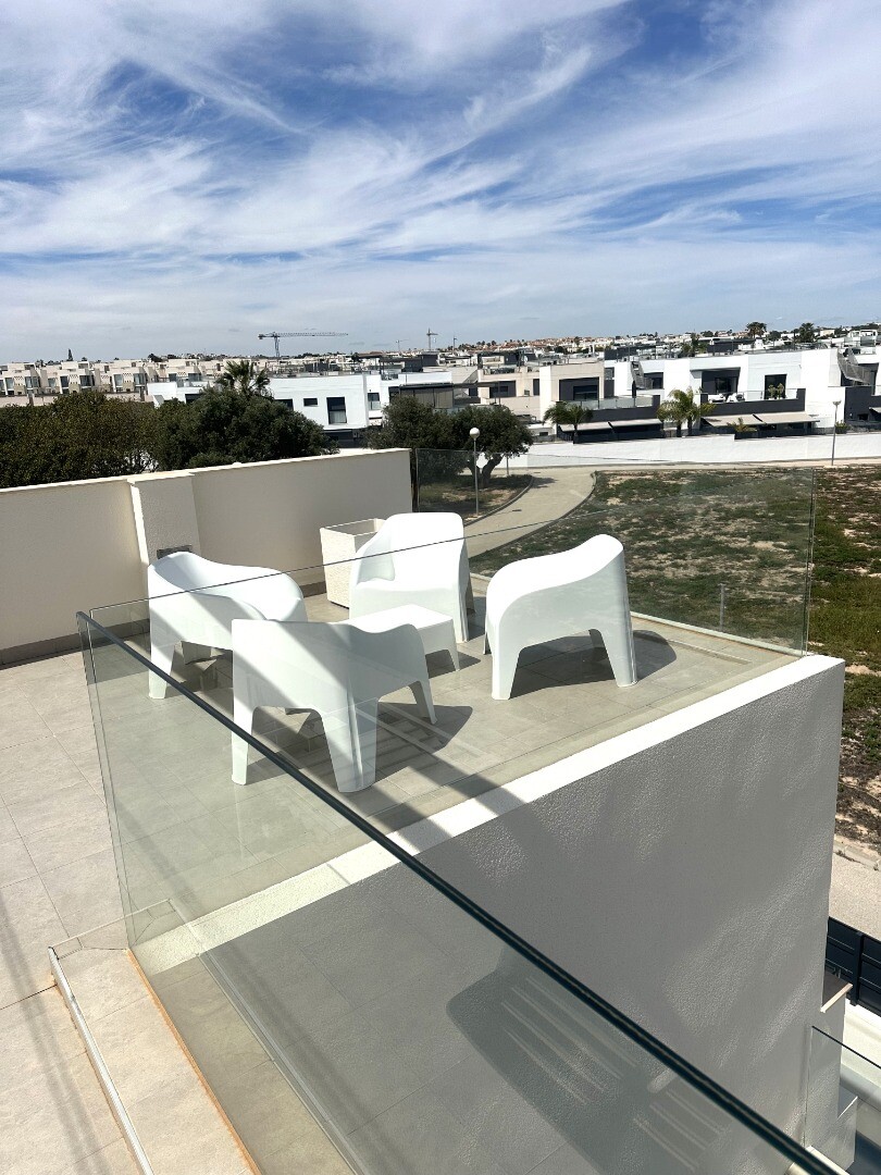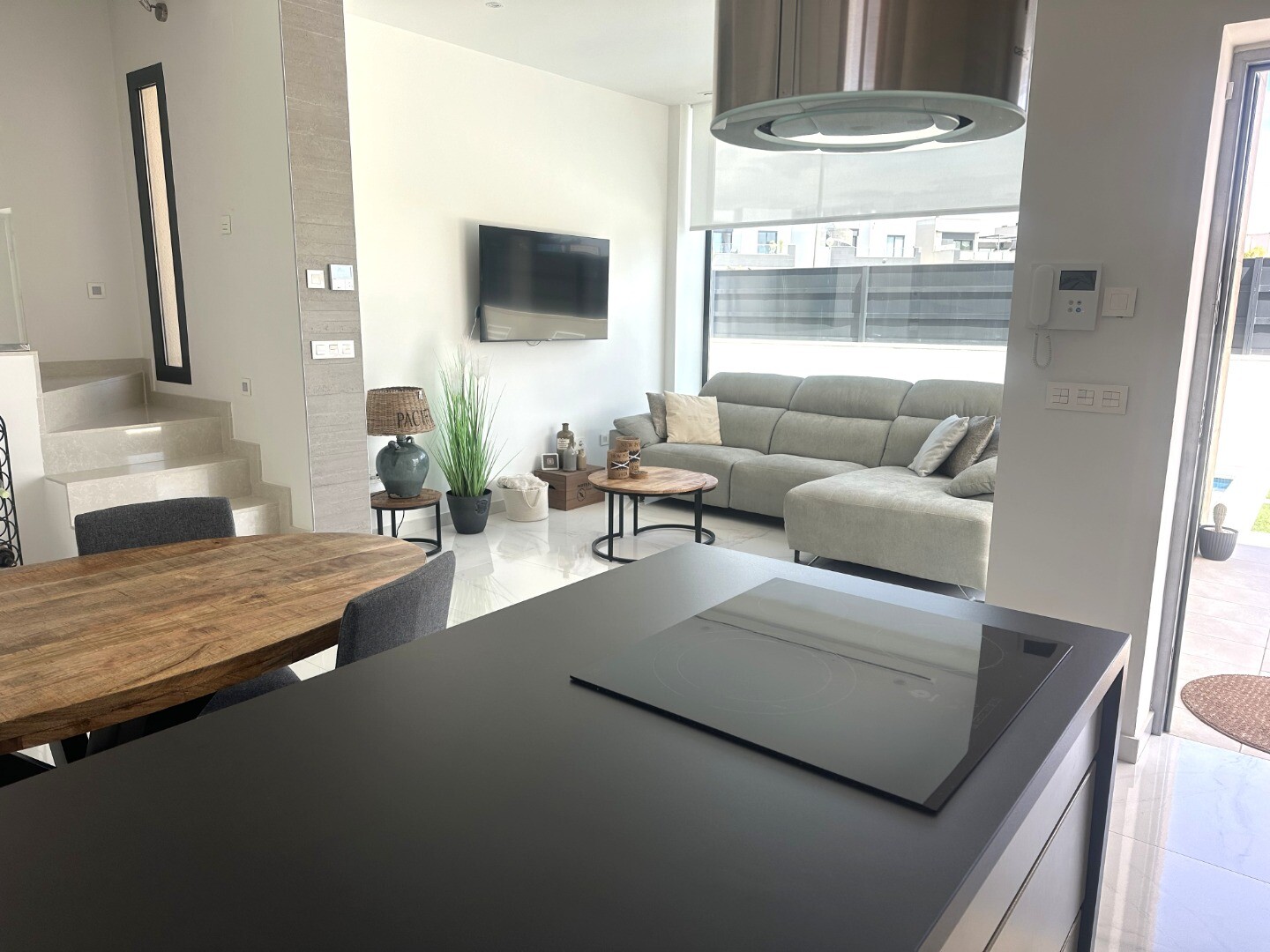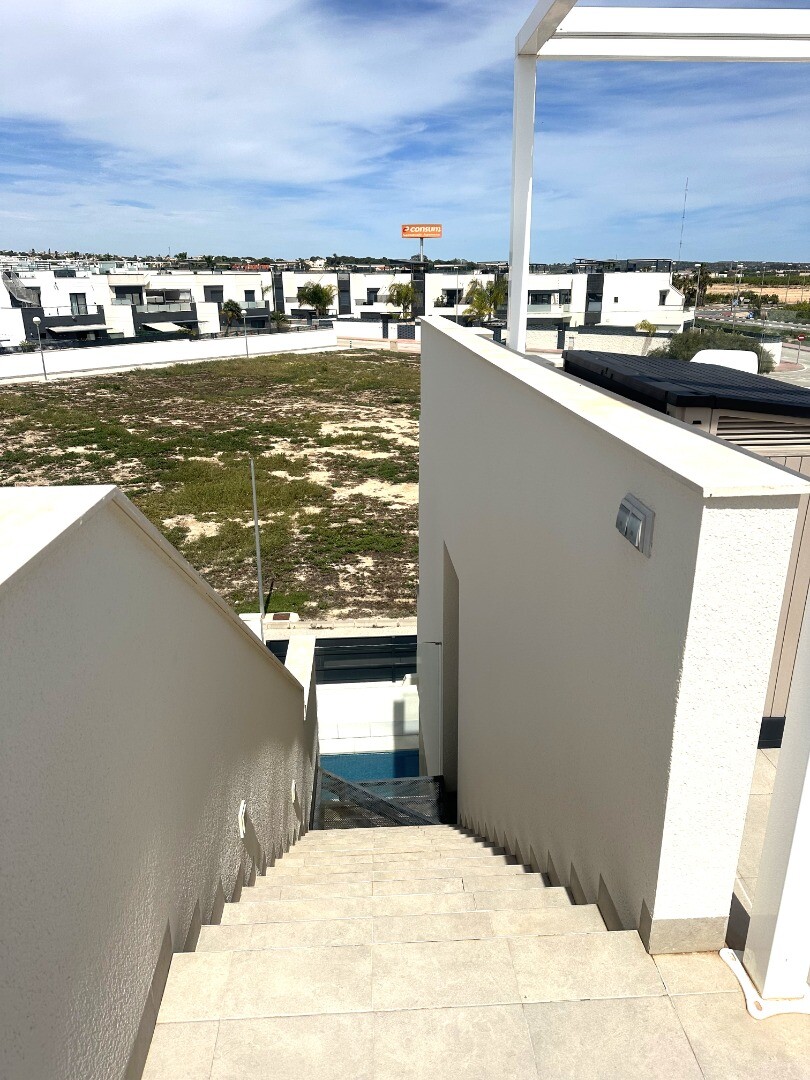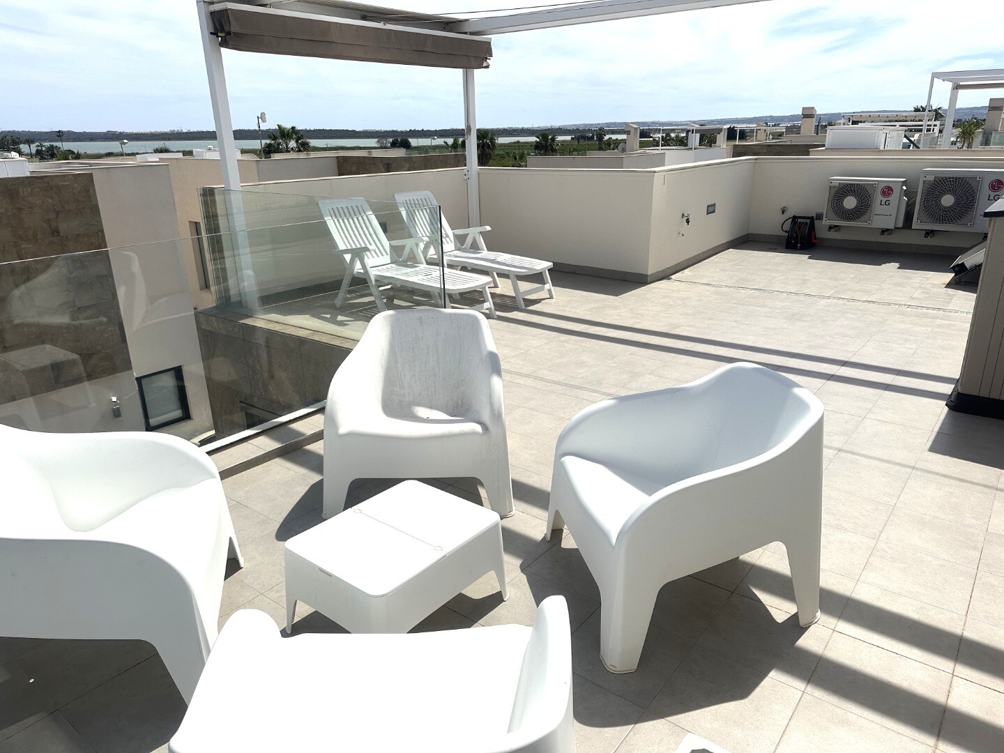 Nowoczesne wille z drugiej ręki w stylu Treze Villas z 2016 r. z widokiem na lagunę w Ciudad Quesada. Ten kompleks w Rojales składa się z 13 nowoczesnych domków, każdy z osobnym wejściem od strony wspólnej drogi. Na prywatnej działce o powierzchni 115m2 znajduje się prywatne miejsce parkingowe w ogrodzie. Na parterze znajduje się jasny, przestronny... salon z widokiem na basen, otwarta kuchnia, sypialnia z podwójnym łóżkiem, łazienka i zadaszony taras. Na pierwszym piętrze znajduje się duża sypialnia z prywatną łazienką i garderobą, z tej sypialni jest wyjście na taras o powierzchni 10m2. Dodatkowo znajdą Państwo pokój dwuosobowy. Na najwyższej kondygnacji znajduje się solarium o powierzchni 44m2. Nieruchomość została w pełni zmodernizowana i wyposażona w dodatkowe udogodnienia, takie jak basen z wodą morską, ogród wyłożony kafelkami, wysokiej jakości oświetlenie, pakiet AGD, otwieracz drzwi z napędem silnikowym, centralną klimatyzację, automatykę domową, a także pompę wodną aerotermalną, która pobiera energię z otaczającego nas powietrza w celu podgrzewania wody, ogrzewania, klimatyzacji, ogrzewania podłogowego i pergolę na tarasie na dachu. Dom został niedawno całkowicie pomalowany z zewnątrz, a ogrodzenie zostało całkowicie zamknięte, dzięki czemu nie jest już widoczny dla przechodniów. Klub golfowy La Marquesa oddalony jest od obiektu o zaledwie 2 km. Centrum handlowe Las Habaneras i plaża Guardamar znajdują się zaledwie 10 minut jazdy samochodem.