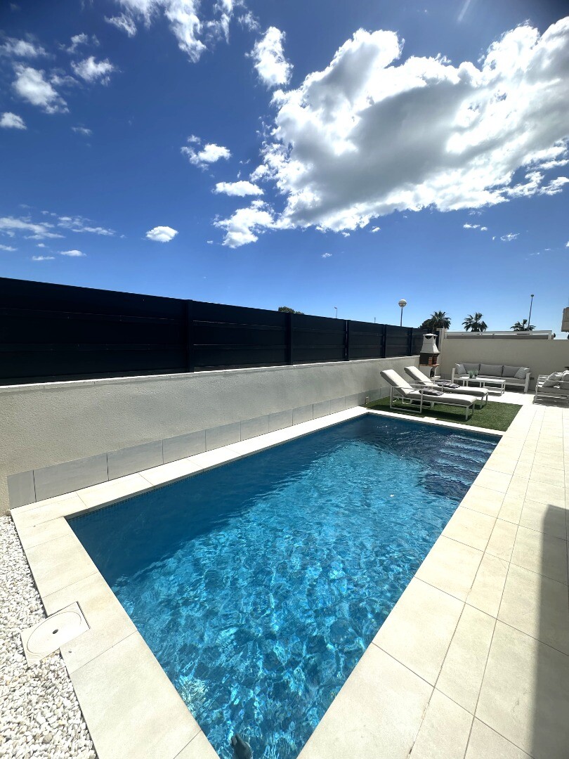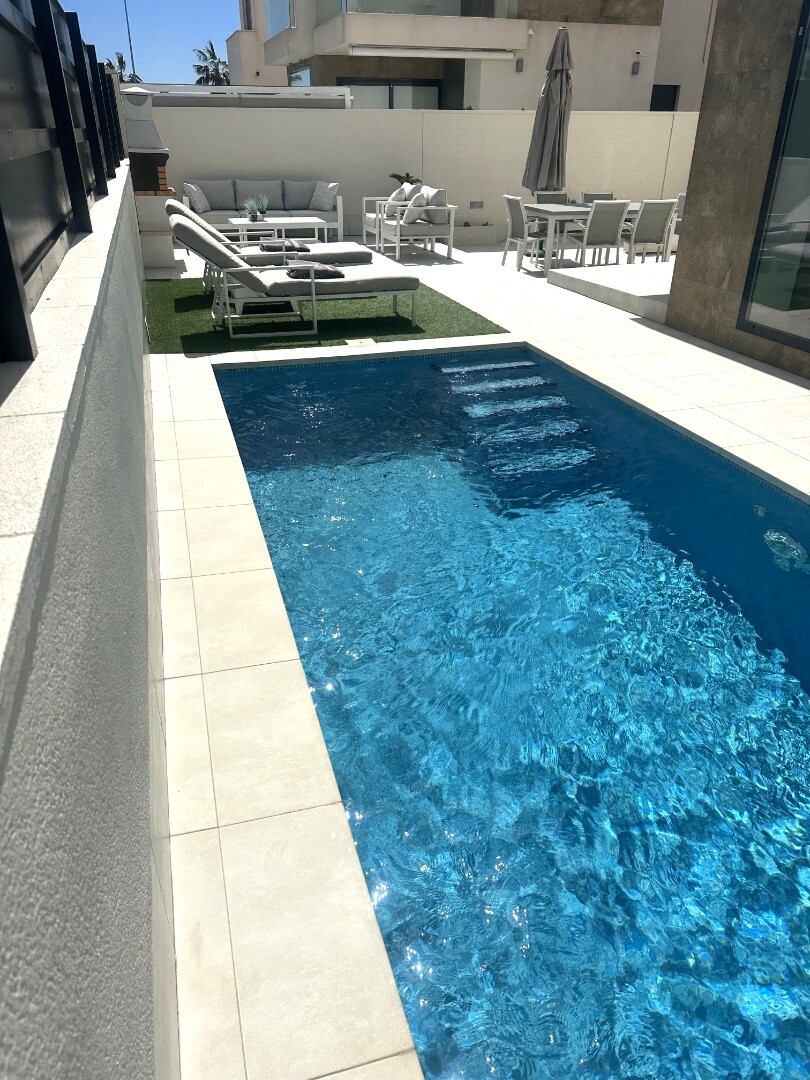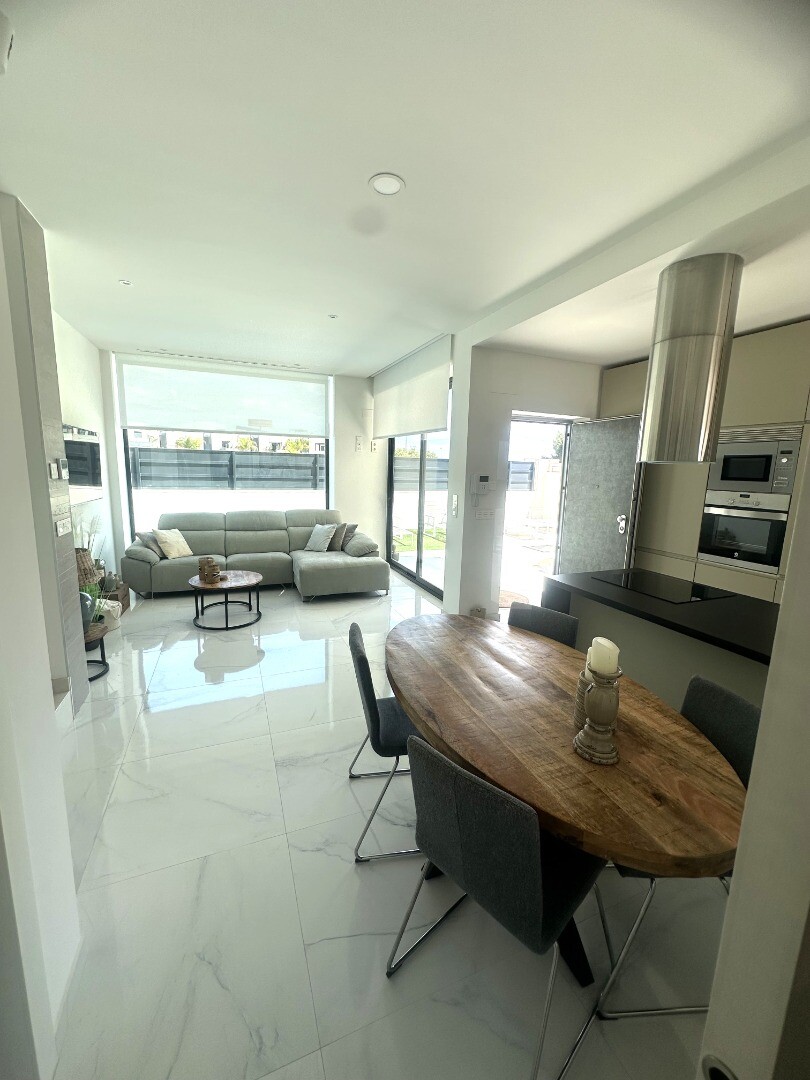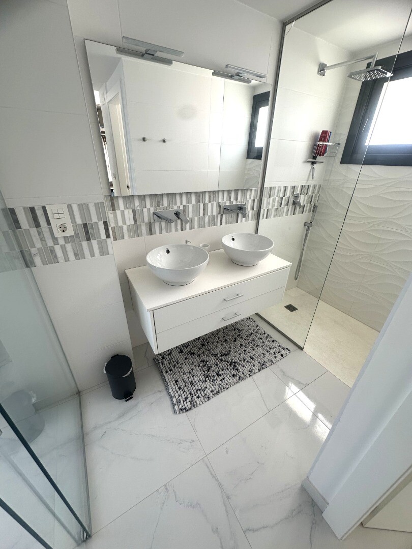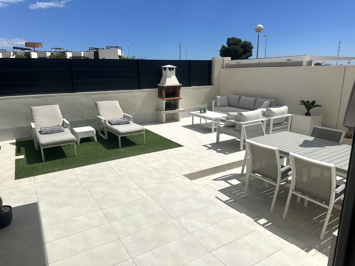 Nowoczesne wille z drugiej ręki w stylu Treze Villas z 2016 r. z widokiem na lagunę w Ciudad Quesada. Ten kompleks w Rojales składa się z 13 nowoczesnych domków, każdy z osobnym wejściem od strony wspólnej drogi. Na prywatnej działce o powierzchni 115m2 znajduje się prywatne miejsce parkingowe w ogrodzie. Na parterze znajduje się jasny, przestronny... salon z widokiem na basen, otwarta kuchnia, sypialnia z podwójnym łóżkiem, łazienka i zadaszony taras. Na pierwszym piętrze znajduje się duża sypialnia z prywatną łazienką i garderobą, z tej sypialni jest wyjście na taras o powierzchni 10m2. Dodatkowo znajdą Państwo pokój dwuosobowy. Na najwyższej kondygnacji znajduje się solarium o powierzchni 44m2. Nieruchomość została w pełni zmodernizowana i wyposażona w dodatkowe udogodnienia, takie jak basen z wodą morską, ogród wyłożony kafelkami, wysokiej jakości oświetlenie, pakiet AGD, otwieracz drzwi z napędem silnikowym, centralną klimatyzację, automatykę domową, a także pompę wodną aerotermalną, która pobiera energię z otaczającego nas powietrza w celu podgrzewania wody, ogrzewania, klimatyzacji, ogrzewania podłogowego i pergolę na tarasie na dachu. Dom został niedawno całkowicie pomalowany z zewnątrz, a ogrodzenie zostało całkowicie zamknięte, dzięki czemu nie jest już widoczny dla przechodniów. Klub golfowy La Marquesa oddalony jest od obiektu o zaledwie 2 km. Centrum handlowe Las Habaneras i plaża Guardamar znajdują się zaledwie 10 minut jazdy samochodem.