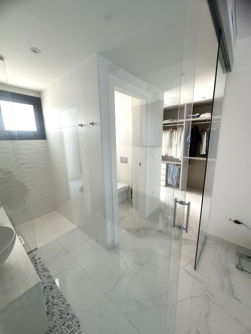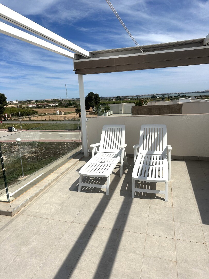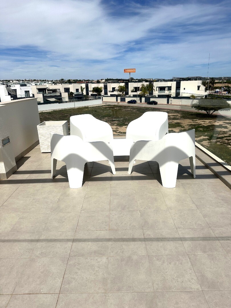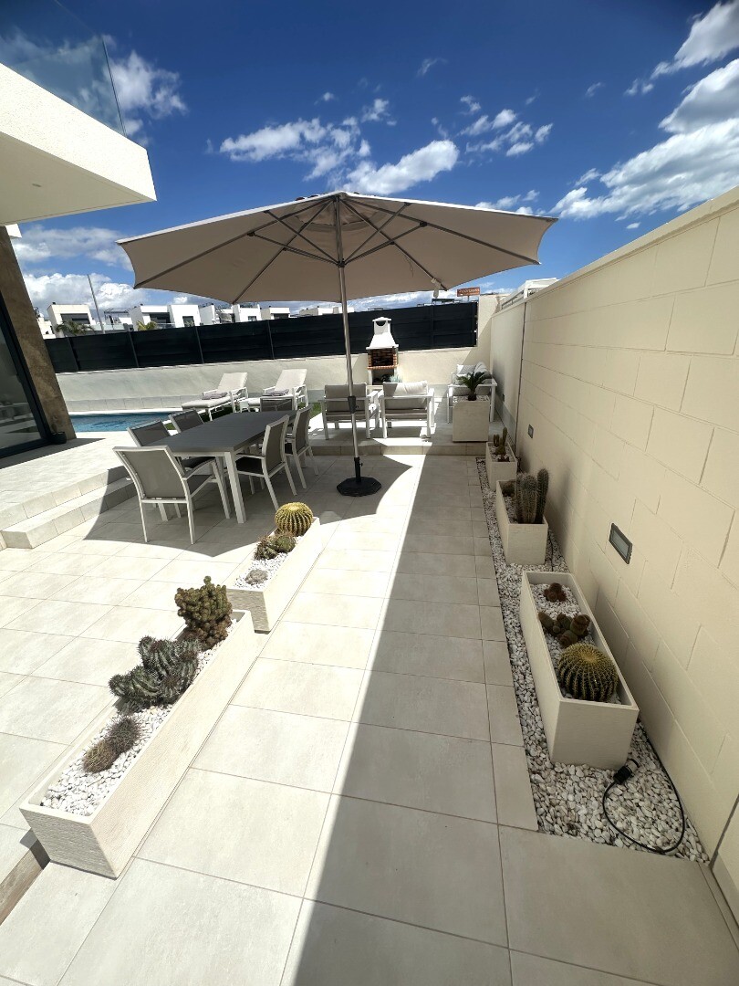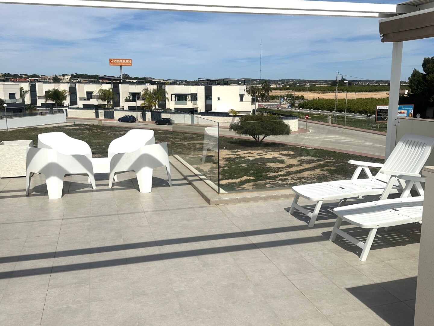 Nowoczesne wille z drugiej ręki w stylu Treze Villas z 2016 r. z widokiem na lagunę w Ciudad Quesada. Ten kompleks w Rojales składa się z 13 nowoczesnych domków, każdy z osobnym wejściem od strony wspólnej drogi. Na prywatnej działce o powierzchni 115m2 znajduje się prywatne miejsce parkingowe w ogrodzie. Na parterze znajduje się jasny, przestronny... salon z widokiem na basen, otwarta kuchnia, sypialnia z podwójnym łóżkiem, łazienka i zadaszony taras. Na pierwszym piętrze znajduje się duża sypialnia z prywatną łazienką i garderobą, z tej sypialni jest wyjście na taras o powierzchni 10m2. Dodatkowo znajdą Państwo pokój dwuosobowy. Na najwyższej kondygnacji znajduje się solarium o powierzchni 44m2. Nieruchomość została w pełni zmodernizowana i wyposażona w dodatkowe udogodnienia, takie jak basen z wodą morską, ogród wyłożony kafelkami, wysokiej jakości oświetlenie, pakiet AGD, otwieracz drzwi z napędem silnikowym, centralną klimatyzację, automatykę domową, a także pompę wodną aerotermalną, która pobiera energię z otaczającego nas powietrza w celu podgrzewania wody, ogrzewania, klimatyzacji, ogrzewania podłogowego i pergolę na tarasie na dachu. Dom został niedawno całkowicie pomalowany z zewnątrz, a ogrodzenie zostało całkowicie zamknięte, dzięki czemu nie jest już widoczny dla przechodniów. Klub golfowy La Marquesa oddalony jest od obiektu o zaledwie 2 km. Centrum handlowe Las Habaneras i plaża Guardamar znajdują się zaledwie 10 minut jazdy samochodem.
