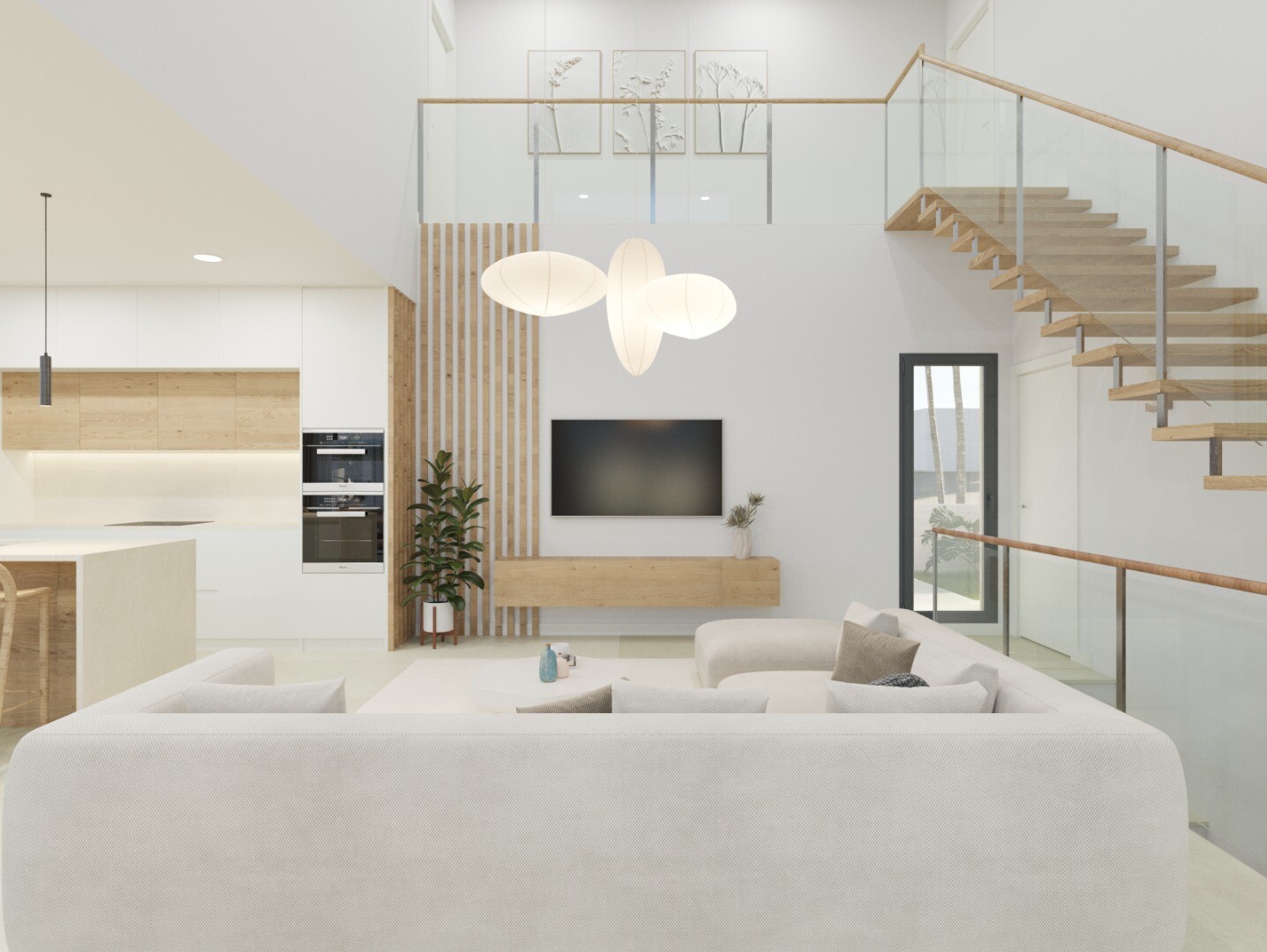 Na parterze wyróżnia się salon z podwójną wysokością, otw...arta kuchnia z wyspą, sypialnia i łazienka. Na piętrze znajdują się dwie sypialnie z łazienkami en suite, każda z dostępem do prywatnych tarasów. Piwnica o powierzchni 105 m² zapewnia wiele możliwości personalizacji.