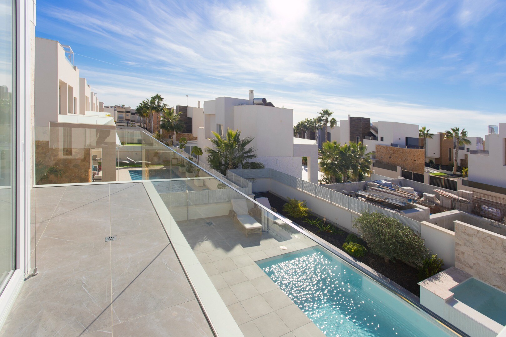 2 wille zlokalizowane w okolicy Aguas Nuevas (Torrevieja) 150 metrów kwadratowych rozmieszczonych w 3 sypialniach, 2 łazienkach i dużym salonie / kuchni. Działki mają 300 metrów kwadratowych. Otwarty widok na basen z wbudowanym jacuzzi i wodospadem z salonu. Duże solarium z grillem na tarasie na dachu.