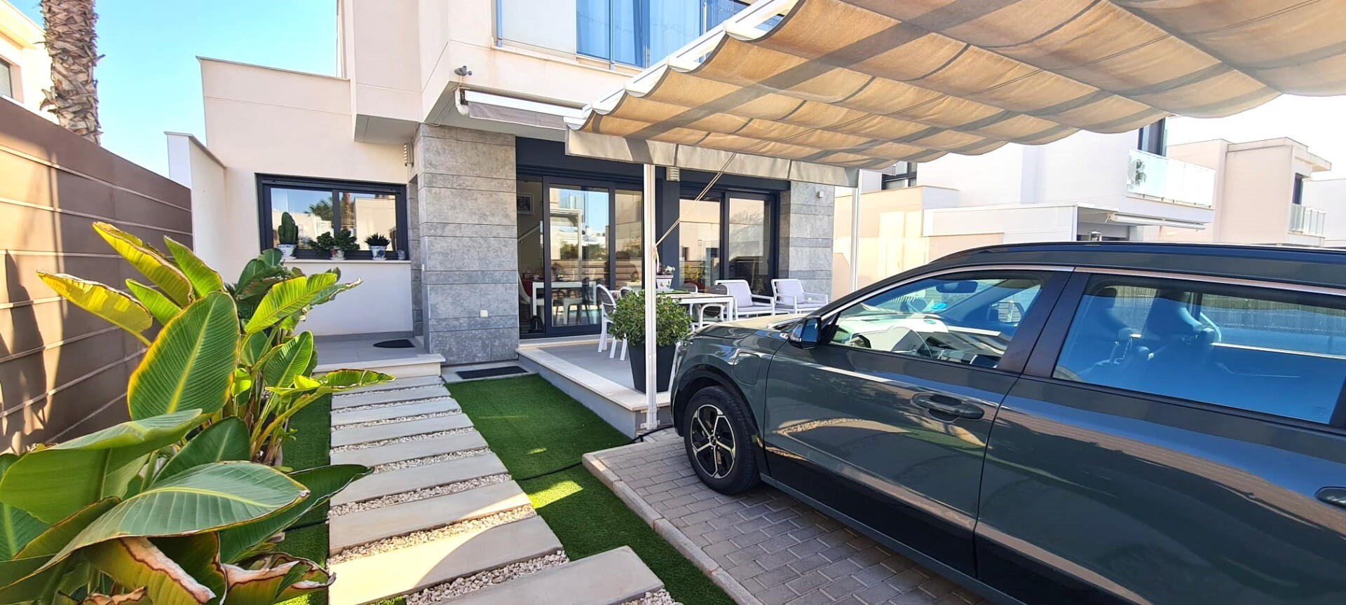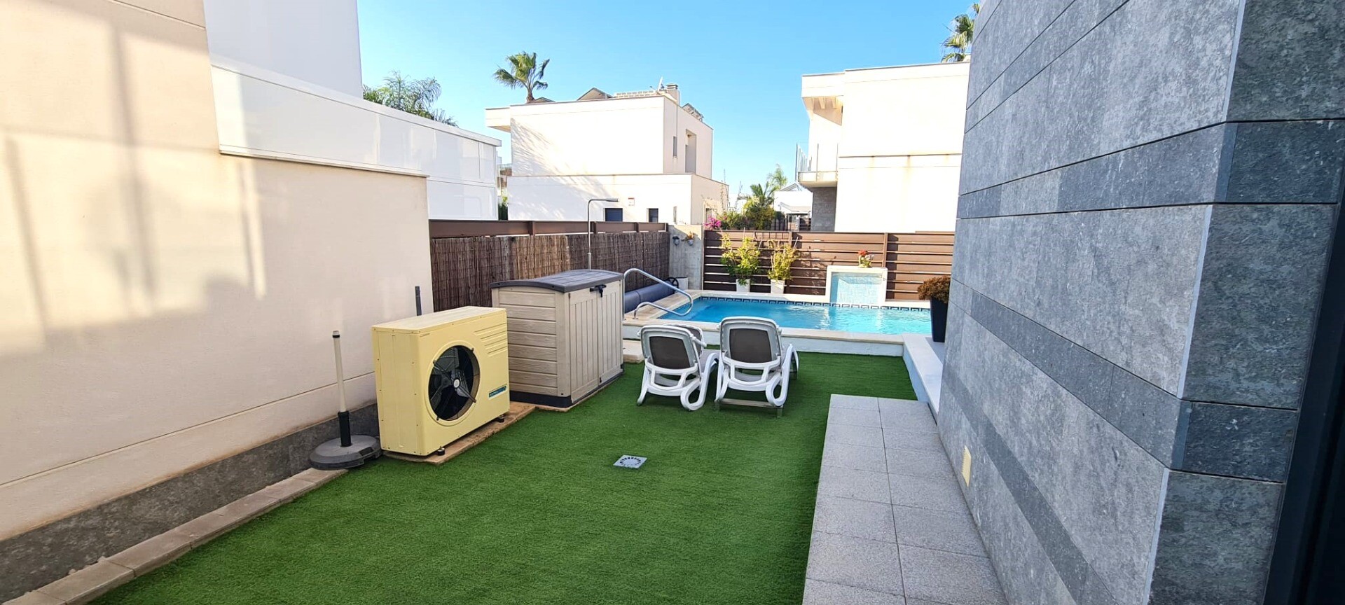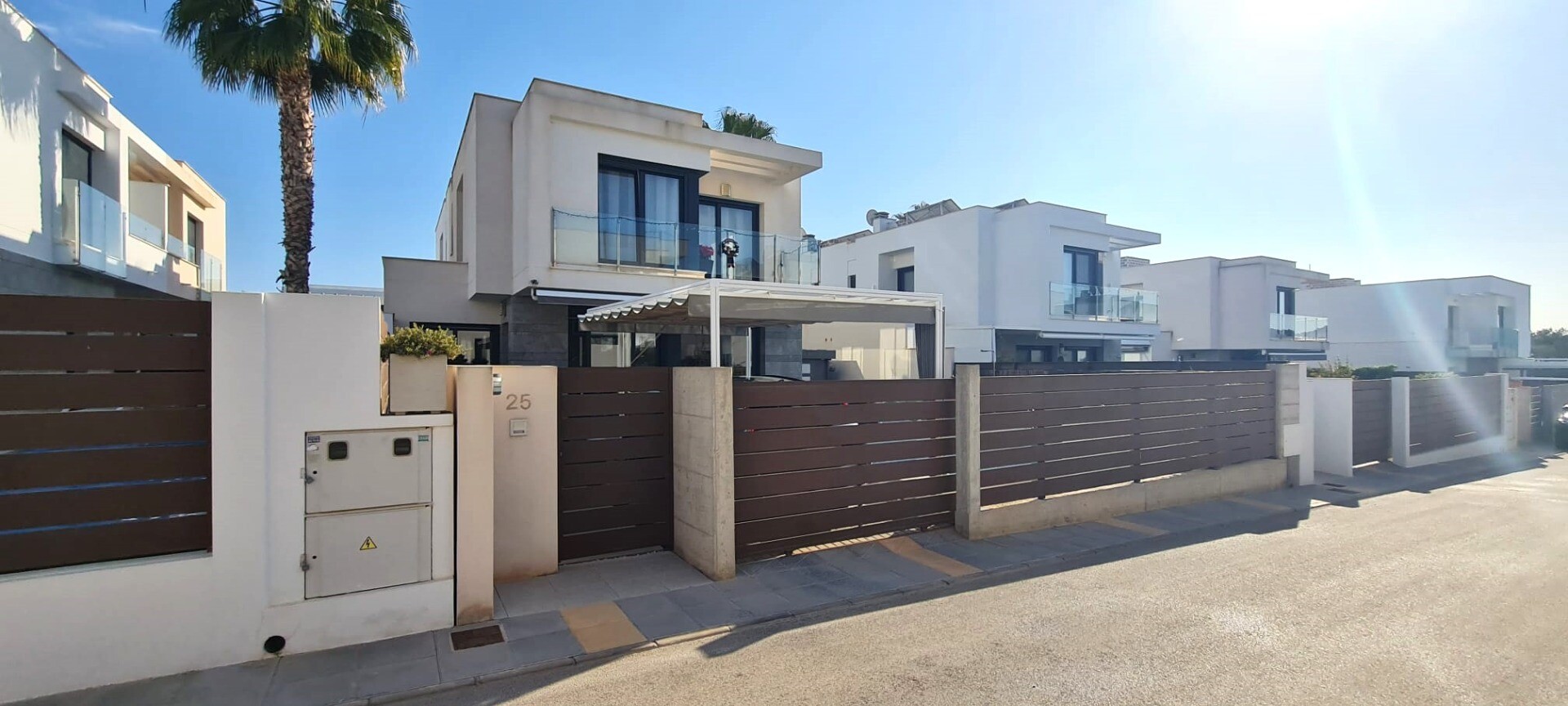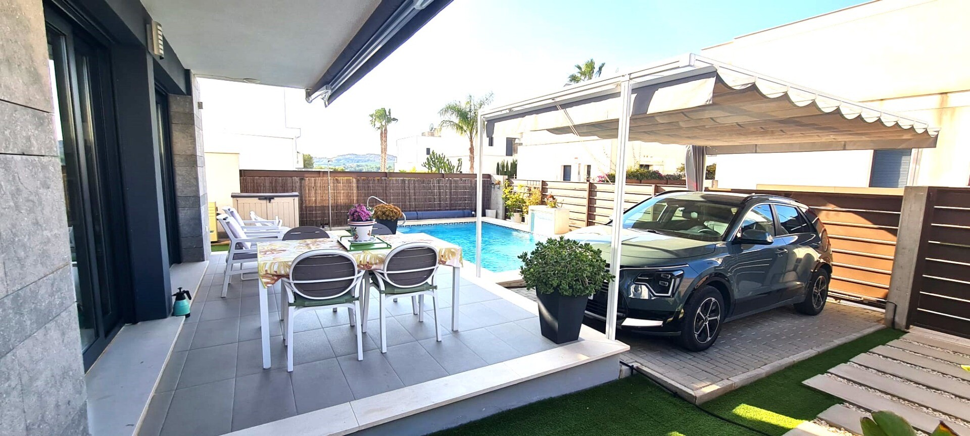 Ta niedawna willa w zabudowie bliźniaczej jest bardzo wyjątkowa ze względu na fakt, że została zbudowana tak, że tylne fasady stykają się ze sobą, co sprawia wrażenie, że jest to willa wolnostojąca na działce o powierzchni 217m2. Posiada podgrzewany basen o wymiarach 3,5 x 6,5 m. Dom ten jest również wyposażony w panele słoneczne, dzięki czemu płac...
