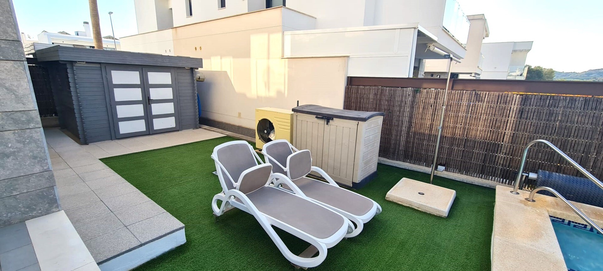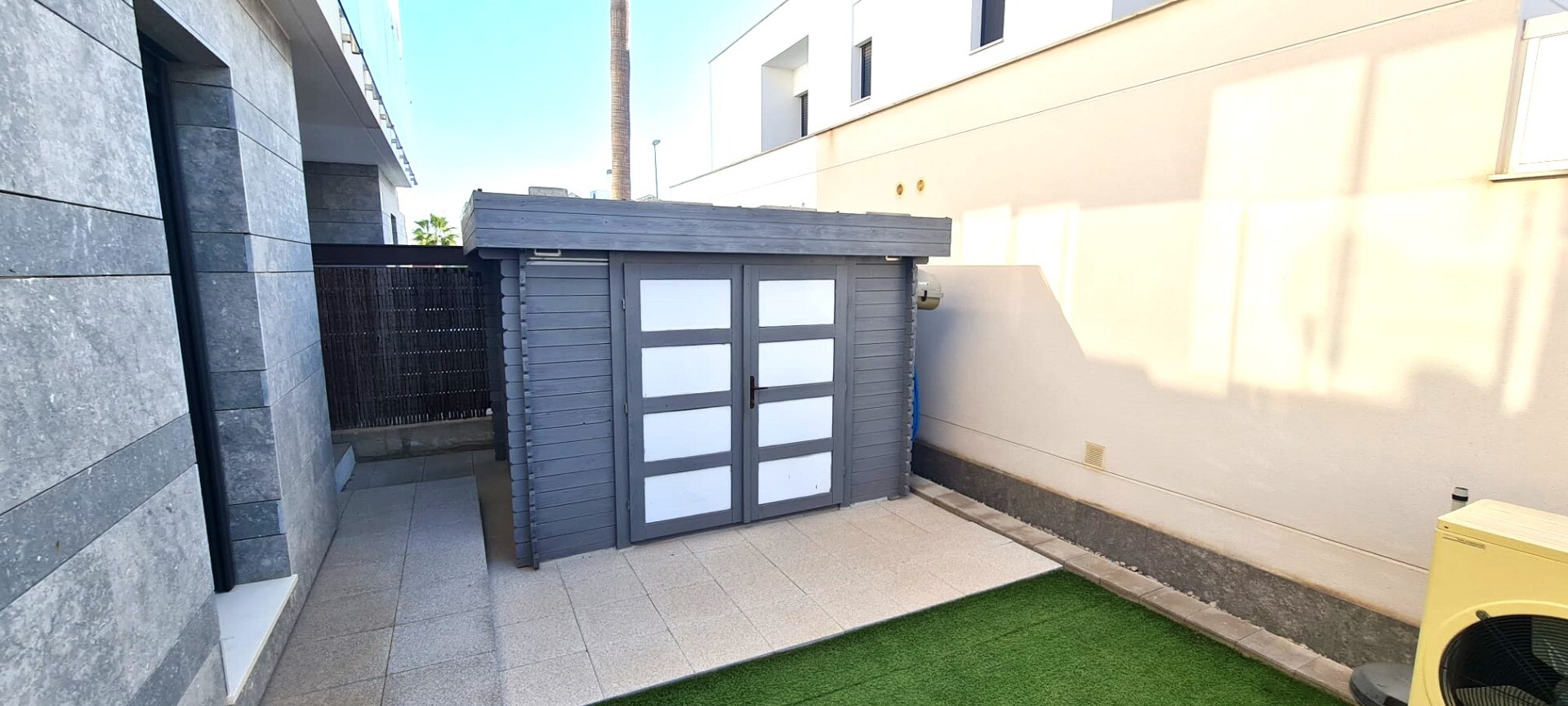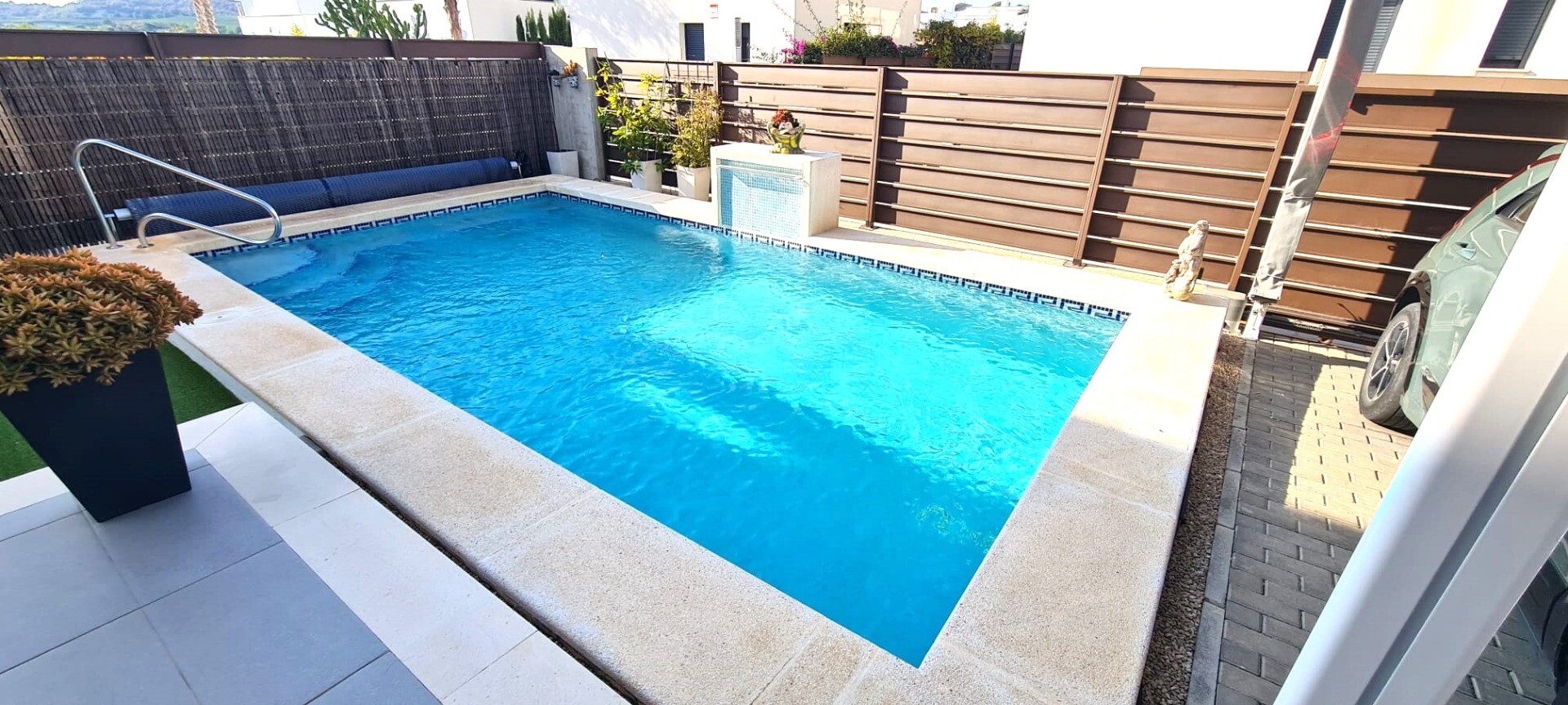 Ta niedawna willa w zabudowie bliźniaczej jest bardzo wyjątkowa ze względu na fakt, że została zbudowana tak, że tylne fasady stykają się ze sobą, co sprawia wrażenie, że jest to willa wolnostojąca na działce o powierzchni 217m2. Posiada podgrzewany basen o wymiarach 3,5 x 6,5 m. Dom ten jest również wyposażony w panele słoneczne, dzięki czemu płac...